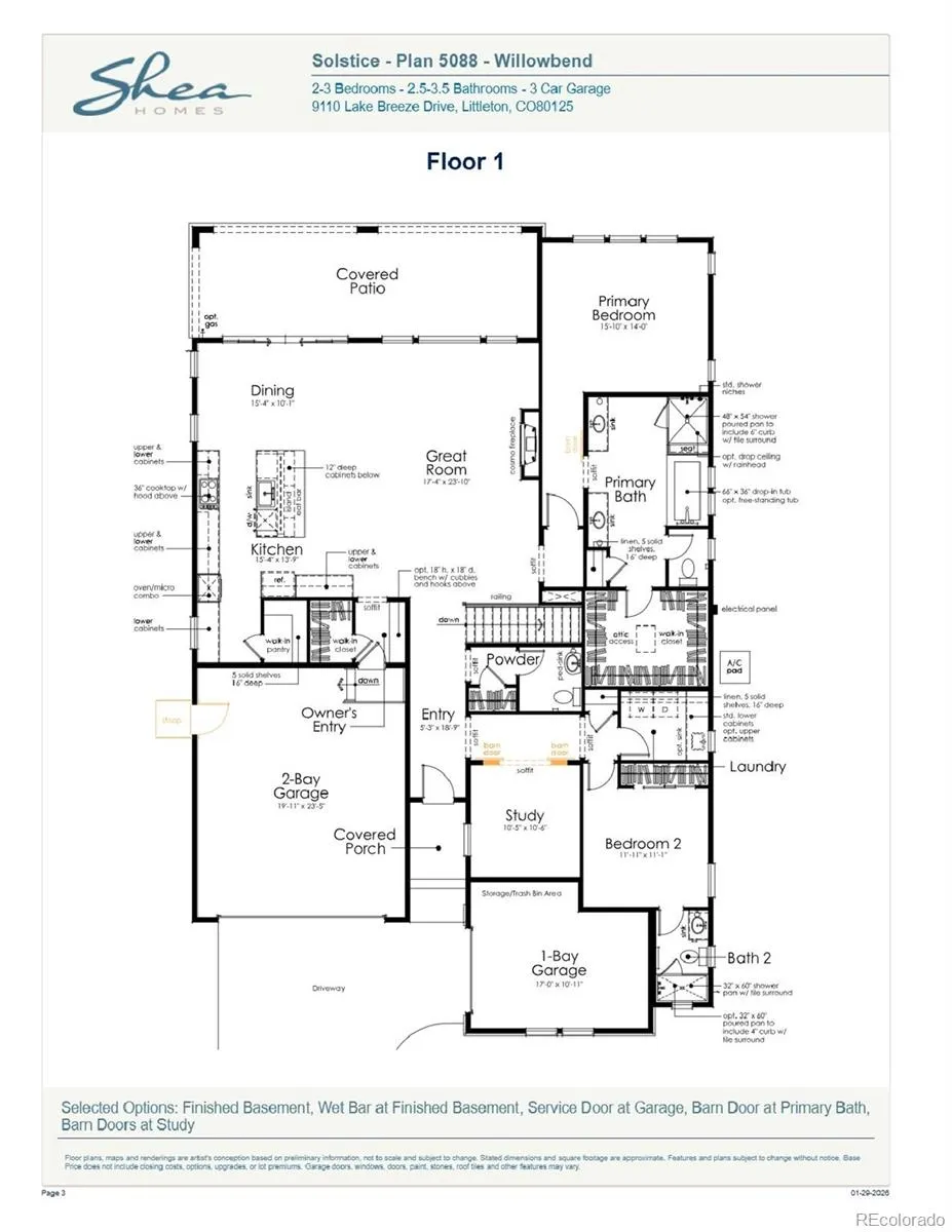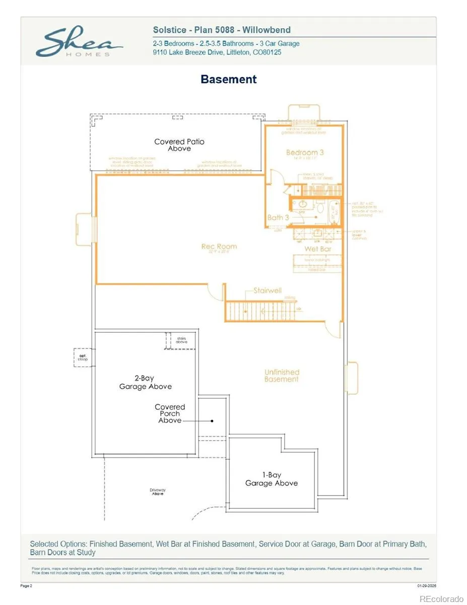 Beautiful one-story home in the desirable Solstice Community by Shea Homes. Solstice is surrounded by Chatfield State Park on 3 sides of the community and acreage parcels on the 4th side. This home has 3 bedrooms, study, finished basement with wet bar, fireplace with full height tile surround, covered patio, and 3-bay split garage. Design finishes include Evoke luxury plank flooring in Summit/Peyton, MSI engineered stone counter tops in Carrara Delphi, horizontal iron railings, and Yorktowne maple cabinets in Dockside. Please contact a community representative for details. The Mirabelle Metropolitan Districts provide various services to the property and in addition to the estimated taxes, a $40 per month operations fee is imposed.