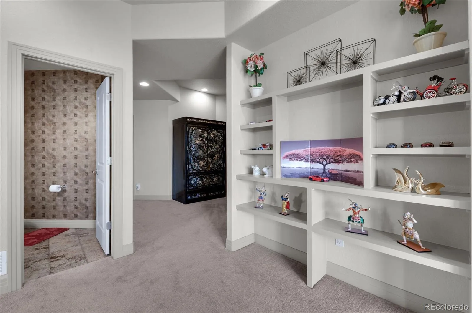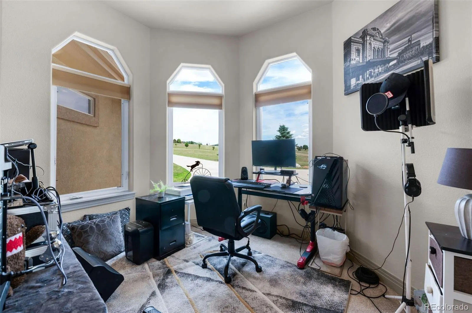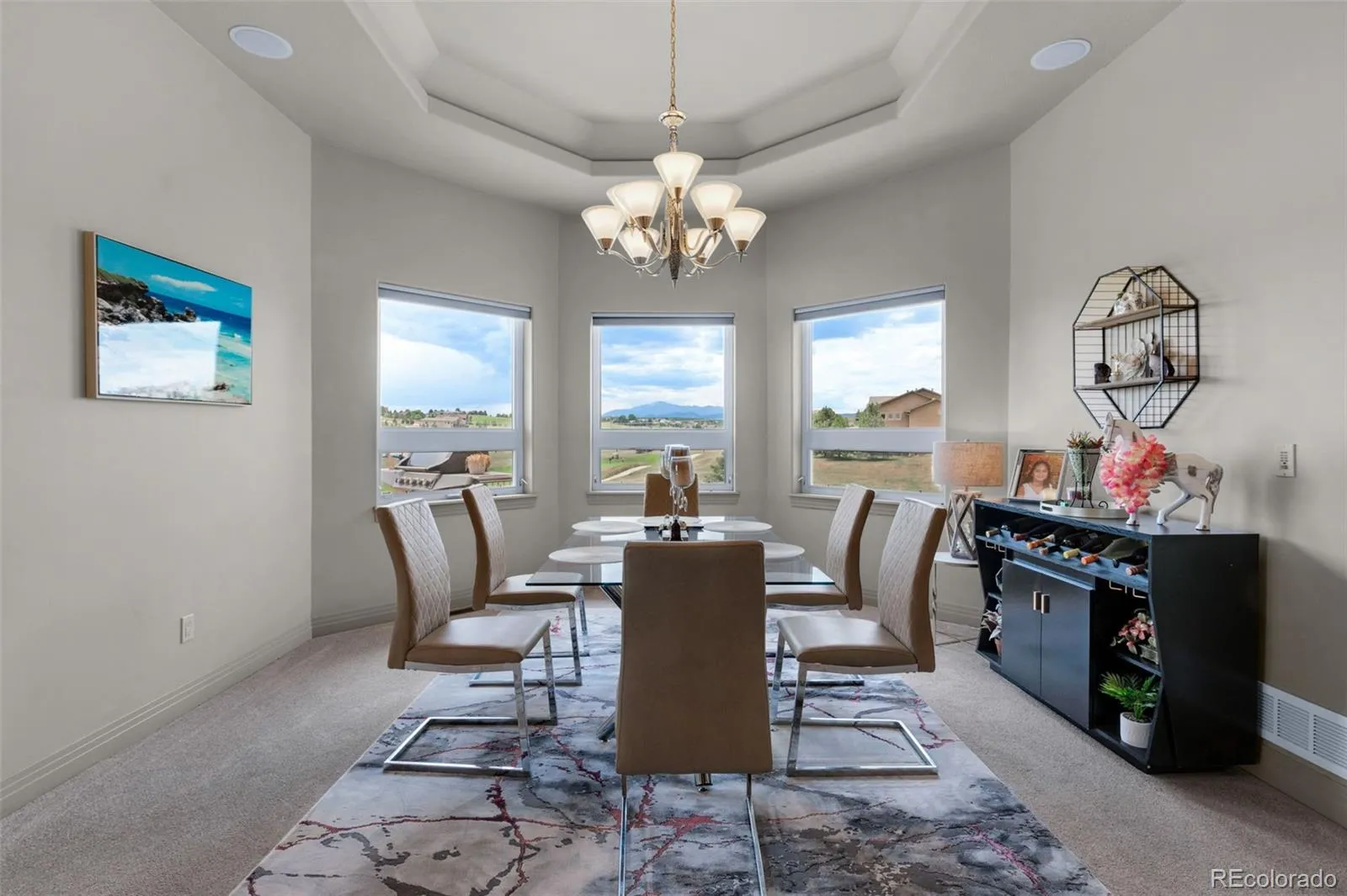 Additional main-level highlights include a formal dining room with bay window overlooking Pikes Peak, an open-concept family room with gas fireplace and a gourmet kitchen ideal for entertaining. The kitchen offers solid surface countertops, breakfast bar seating, high-end appliances and a Butler’s Pantry providing abundant storage and prep space.