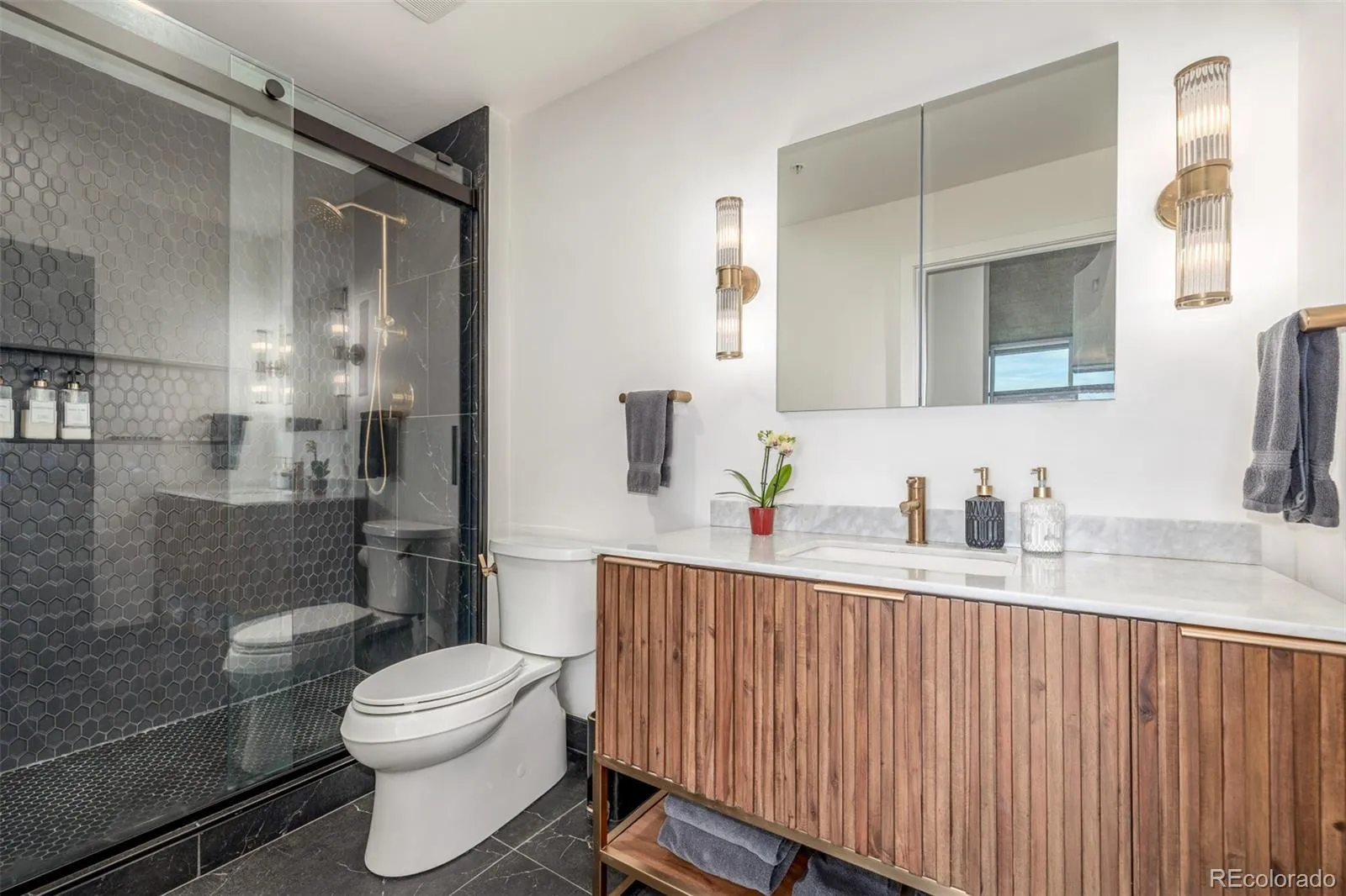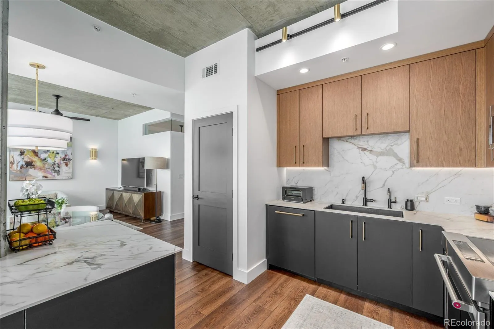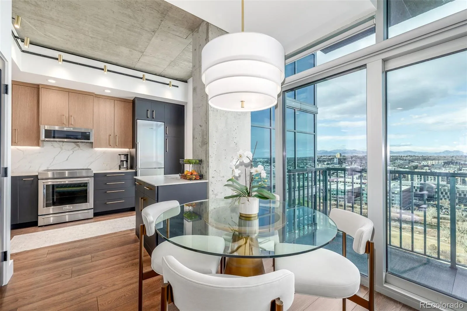 This stunning fully renovated 19th-floor condo in the iconic Glass House offers a blend of modern design, breathtaking views, and unbeatable convenience. Step inside and discover a thoughtfully designed layout. The living room with floor-to-ceiling windows floods the home with natural light and showcases the vast views of the Front Range Mountains, Commons Park, and the Platte River. The sleek all new European modern style kitchen with 2cm Porcelanosa counter tops, full 42″ height cabinetry, under cabinet, lighting, lazy-Susan corner cabinet, pantry with pull outs and an added island for additional counter space. Additional features include a KitchenAid Induction cooktop, stainless oven and microwave and Bosch a refrigerator. There is new luxury vinyl flooring throughout, new trim, luxury doors and roller window blinds, all adding warmth and sophistication. The bedroom is generously sized and has an added glass transom window to adds natural light. The large closet is ELFA-outfitted for shelving , while an oversized hall closet provides even more storage. Living in the Glass House means enjoying world-class amenities right at your fingertips. The 8th-floor pool and clubhouse level offer a tranquil escape, complete with a rooftop fire pit, community BBQ grills, workspaces, lounge and cityscape views. Health enthusiasts will love the included membership to the private Riverfront Athletic Club, offering personal training and a variety of fitness classes. Situated in the heart of Riverfront Park, one of Denver’s most coveted neighborhoods, just steps from Commons Park, the Platte River, and a vibrant mix of restaurants, shops, trails, and entertainment. Commuters have quick access to I-25, Union Station and the close connection to the newly updated 16th Street and the free transit buses for easy access to the central business district. Plus, you’ll enjoy the added convenience of one of the widest & best parking spaces #039 private storage unit on level 1-#107.