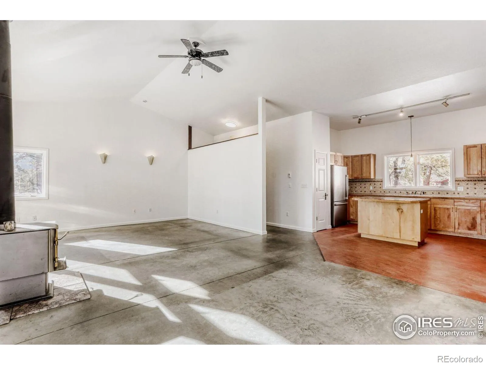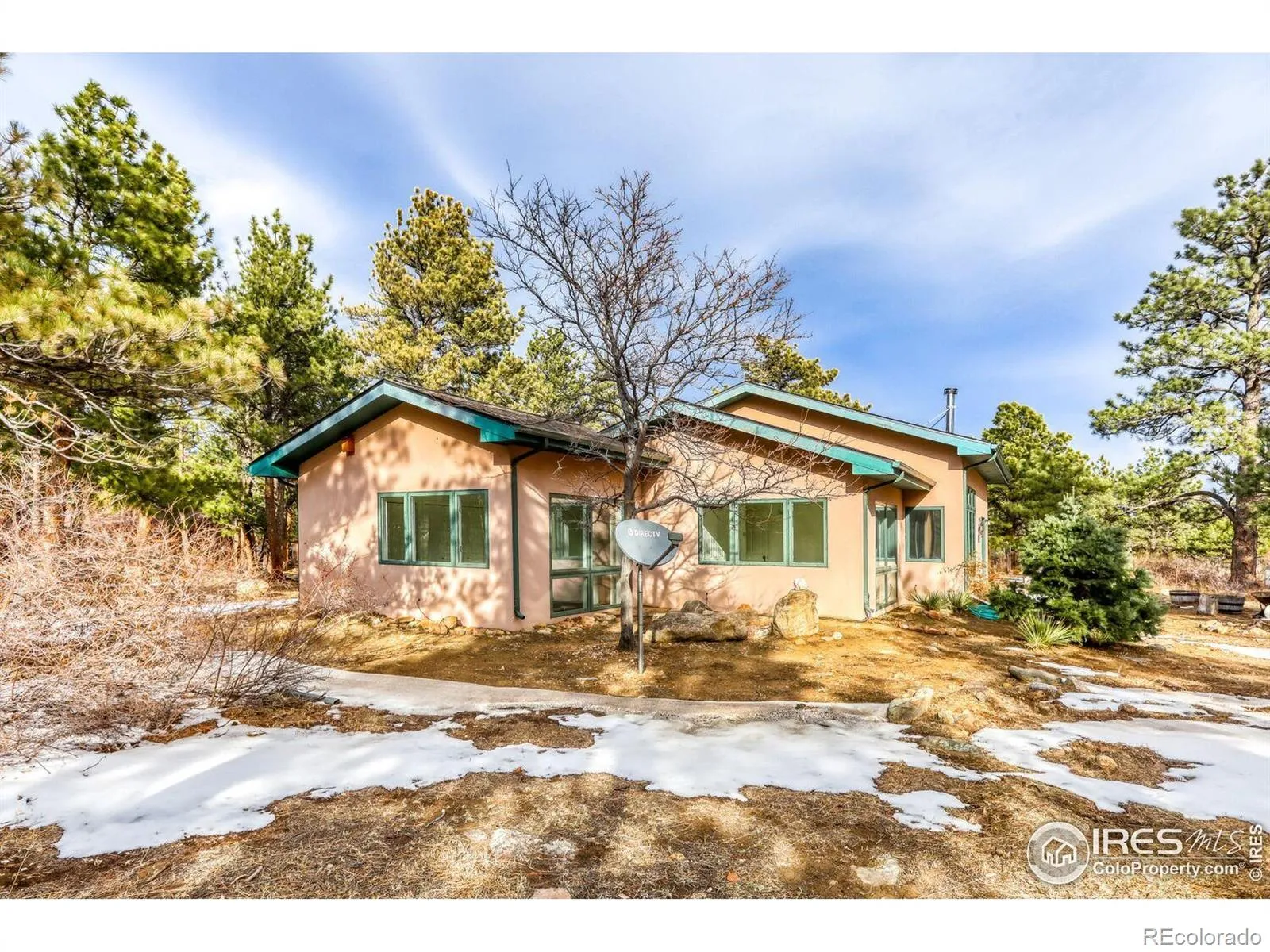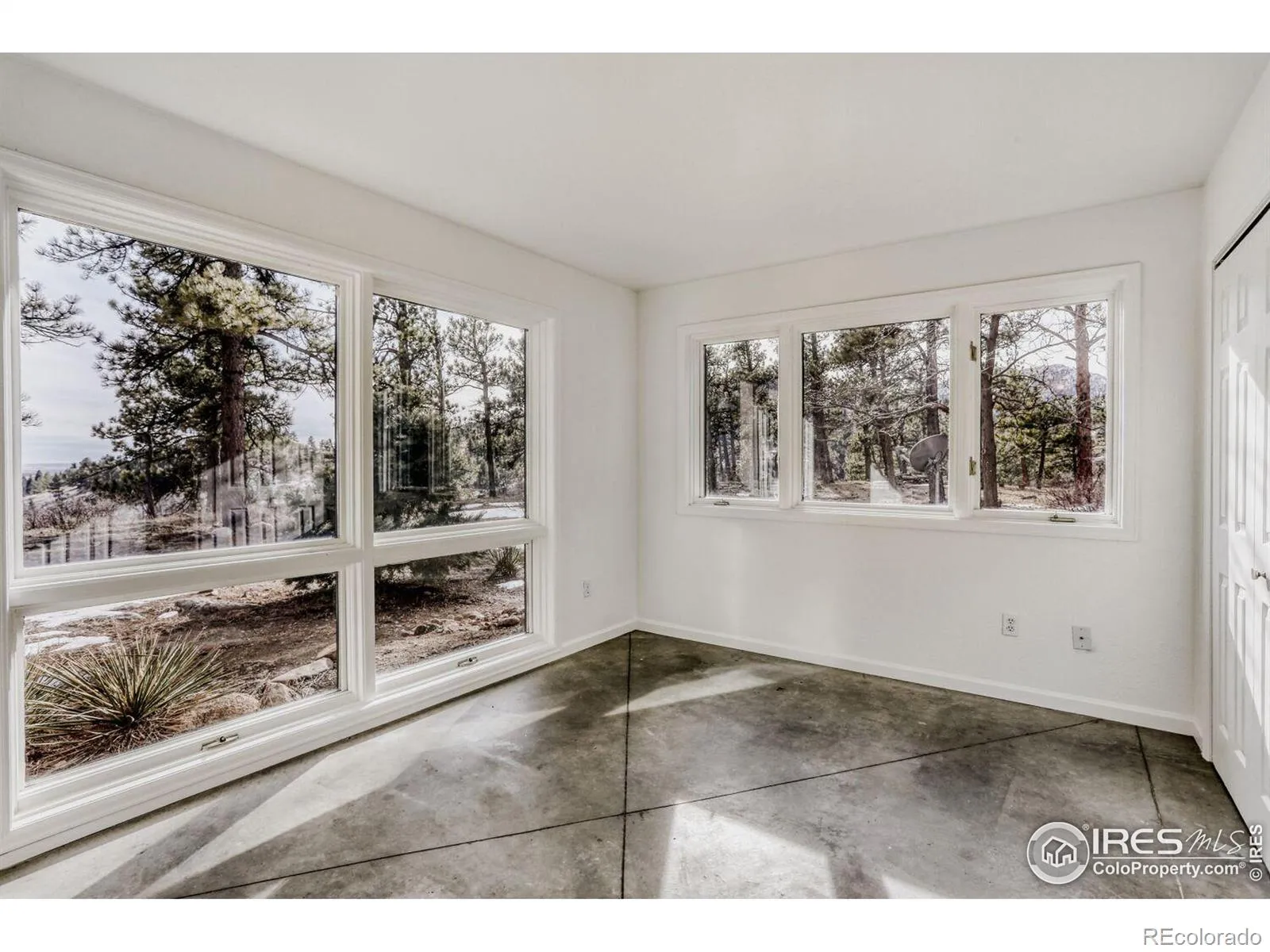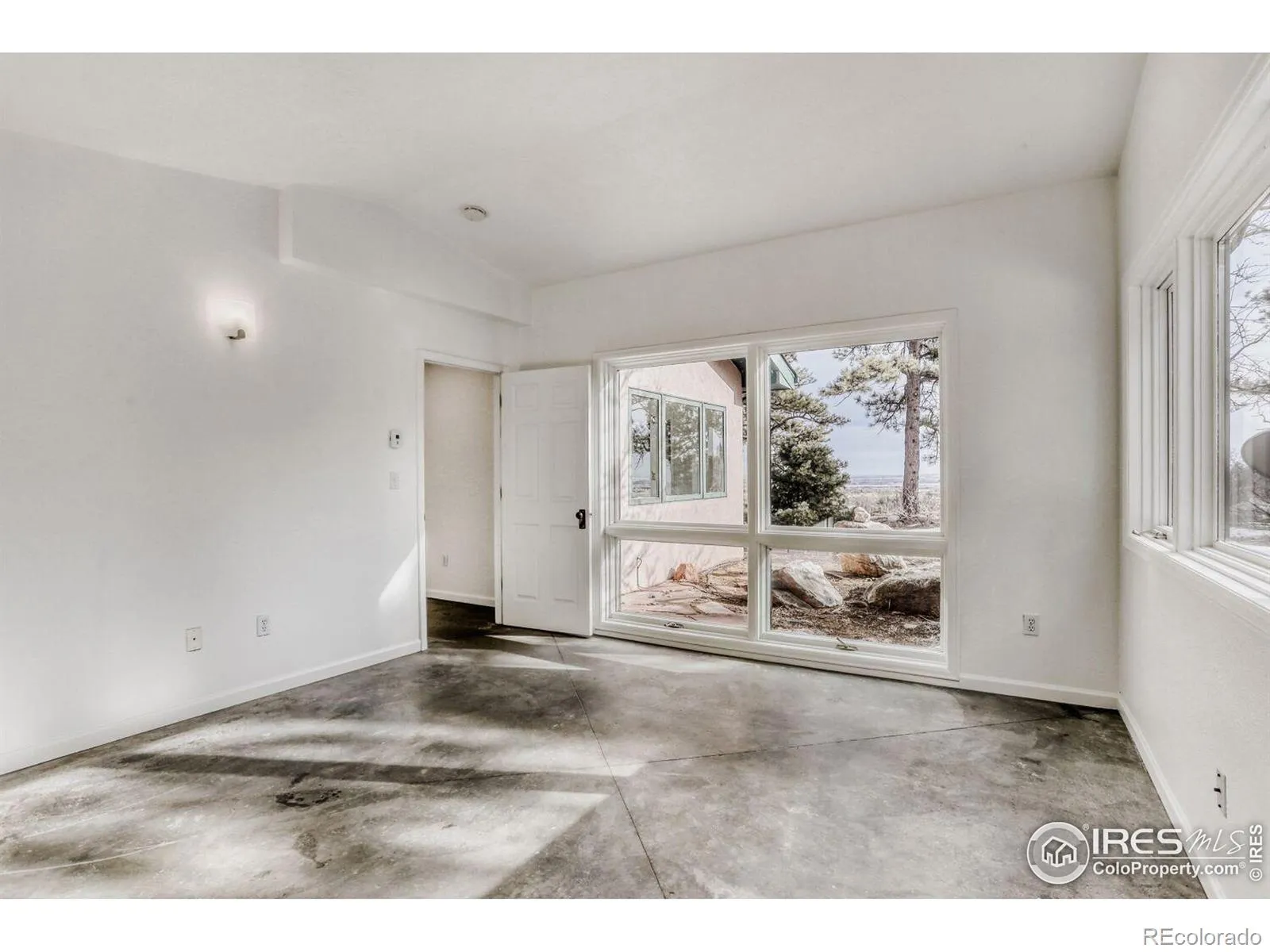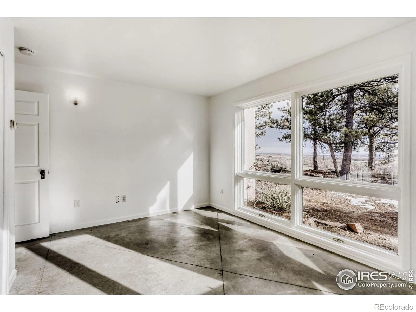 Perched at the top of a private driveway, this rare property offers unobstructed, sweeping views of the Front Range plains, foothills, and iconic Flatirons. South-facing and thoughtfully designed, the home captures abundant natural light and benefits from passive solar warmth, beautifully complemented by modern concrete flooring throughout. An open floor plan with vaulted ceilings enhances the airy feel, while the centrally located wood-burning stove adds cozy warmth and charm to the main living space. Step outside to the south-facing flagstone patio and take in the captivating, ever-changing views-perfect for relaxing or entertaining. Recent updates include a new septic tank, fresh paint, and other improvements, making this home move-in ready. With solid construction and potential to expand, this is a truly special opportunity in an exceptional setting.
