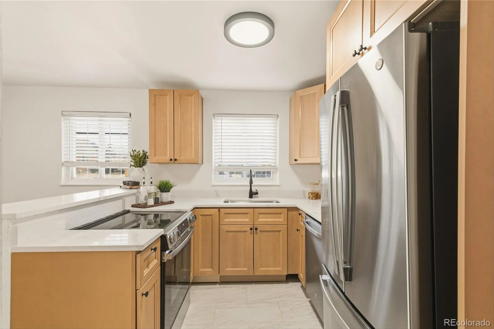 The kitchen includes quartz countertops, new cabinetry, and stainless steel appliances, offering a practical space for everyday use. Both bathrooms have been updated with modern fixtures and finishes. The bedrooms provide flexible options for sleeping or working from home.