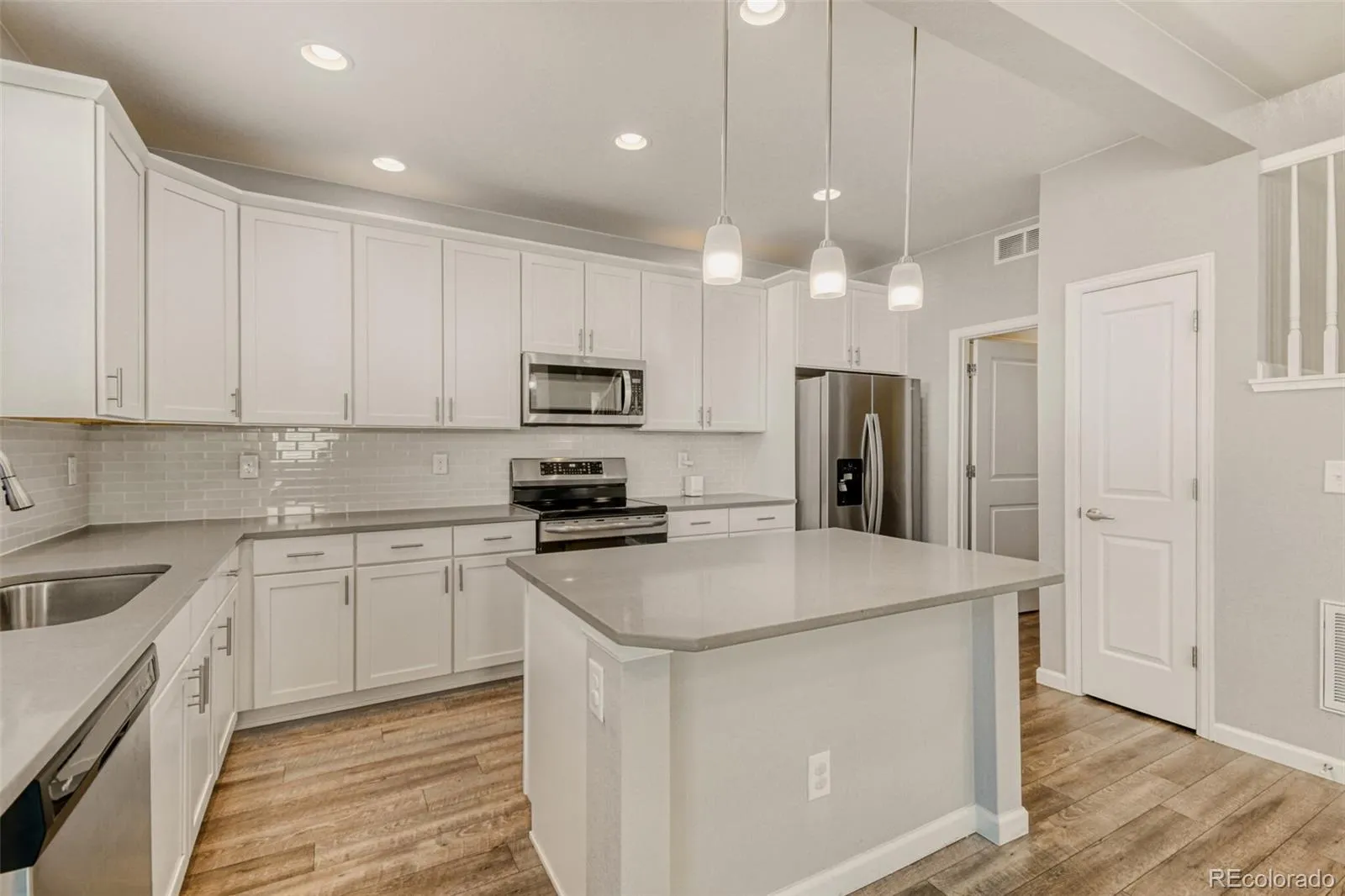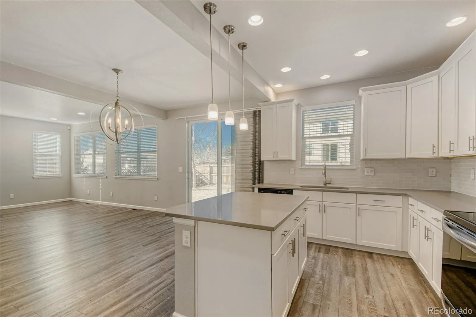 The kitchen offers stainless steel appliances, including an induction range with air fryer, microwave, and refrigerator, 42 inch upper cabinets, subway-tile backsplash, center island, quartz countertops, and a pantry. A spacious dining area opens seamlessly to the living room, creating an ideal setting for everyday living and entertaining.