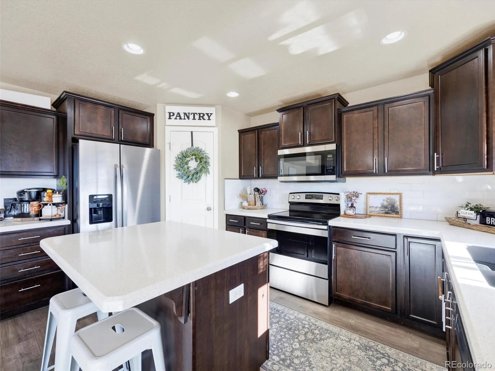 Step into this inviting home and enjoy a spacious open floor plan on the main level, perfect for entertaining. The living room, dining room and kitchen are all connected and open concept. The kitchen features a walk-in corner pantry and matching stainless steel appliances. Luxury vinyl plank flooring throughout main level provides low maintenance. A half bath is also included on the main level, providing easy access for your guests. Step out onto the oversized patio to relax in the backyard. There is a tall vinyl fence included along the back of the property and large mature trees on each side to provide privacy from the neighbors. The front and back yards are low maintenance and community maintained. No need to cut your own grass. Escape the heat in the summertime and enjoy an air conditioned home. The upper level features three bedrooms, two bathrooms and a separate laundry room. The primary bedroom includes an ensuite 5-pc bath with separate soaking tub, shower, enclosed restroom, and an oversized walk-in closet. Close to shopping, entertainment, parks, trails, and schools.