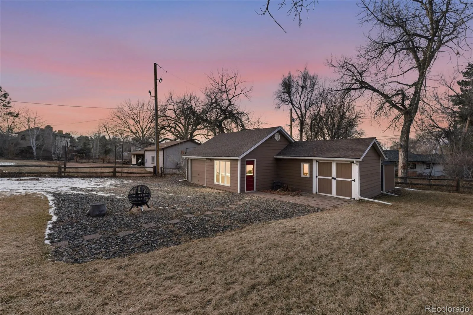 Private .69-acre retreat backing to a seasonal ditch. This modern home is fully updated with designer choices and custom finishes including Hickory hardwoods, maple cabinets, and granite slab countertops. Stainless appliances and a large island complete the open concept kitchen. The primary bedroom offers generous space plus a walk-in closet and five-piece ensuite bathroom. The lower level features daylight windows in the second living room, a stone wood-burning fireplace, and NEW flooring. Two additional bedrooms are also on the lower level. The attached oversized two-car garage provides bonus storage and vehicle space. The large lot includes a spacious back deck perfect for entertaining. An amazing 800-square-foot bonus building offers endless possibilities—game room, home office, or workshop! This additional structure already has power and heat. The expansive lot backs to Church Ditch with seasonal water running through. Mature fruit trees line the large, flat, usable property, creating a beautiful outdoor oasis.