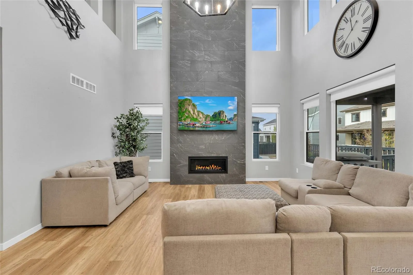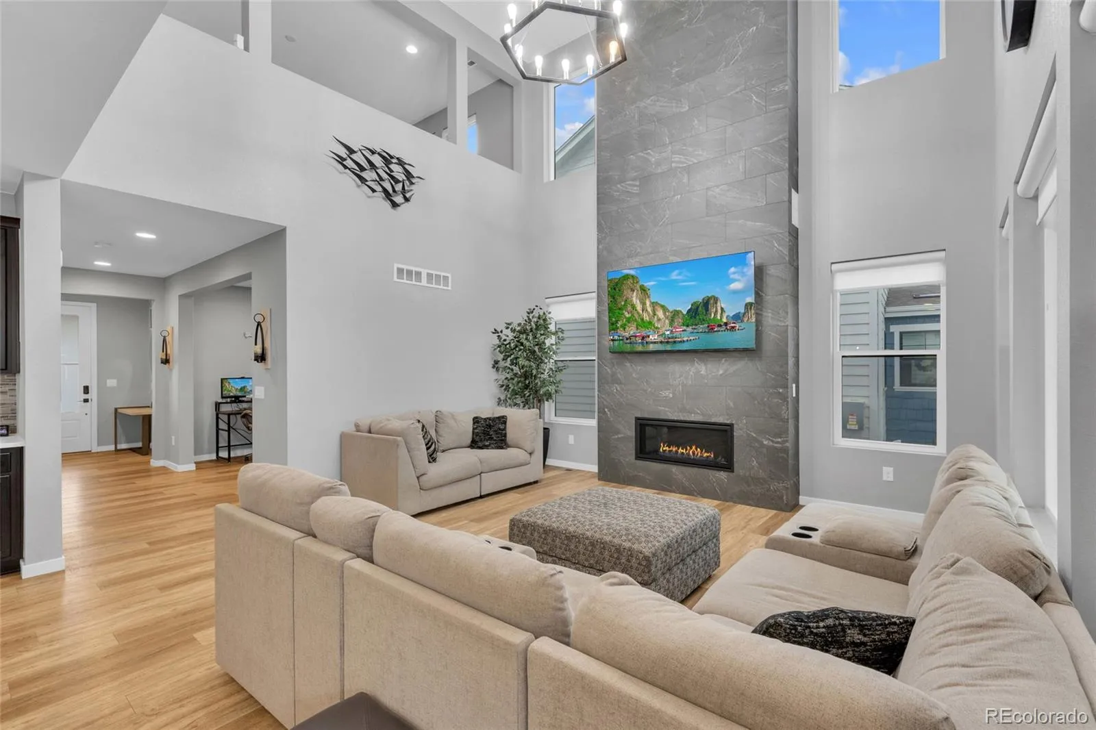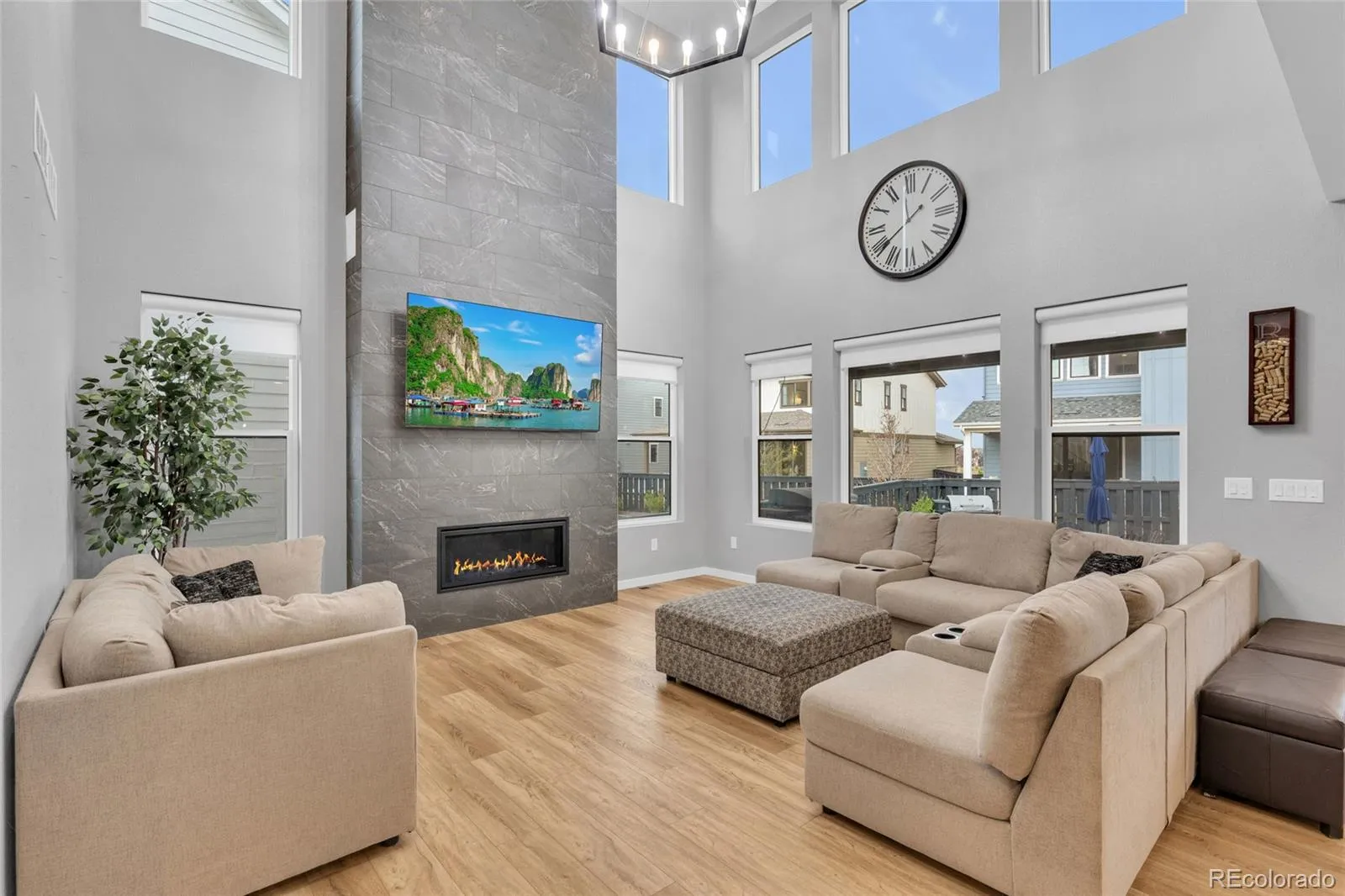 This thoughtfully designed home features soaring ceilings, 8-foot interior doors throughout, and expansive windows that flood the space with natural light, creating a bright and open feel from the moment you enter. The main level showcases wide plank flooring, upgraded lighting, and a stunning 20-foot tile fireplace feature wall that anchors the living space and creates a true focal point for both everyday living and entertaining.