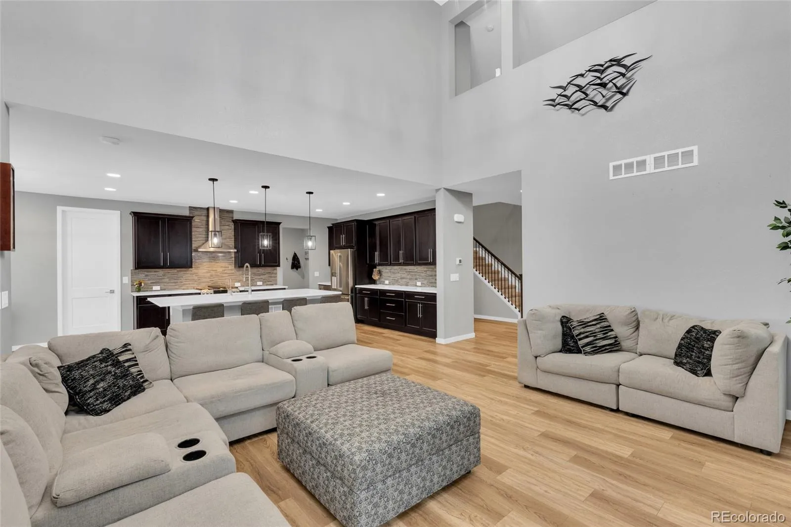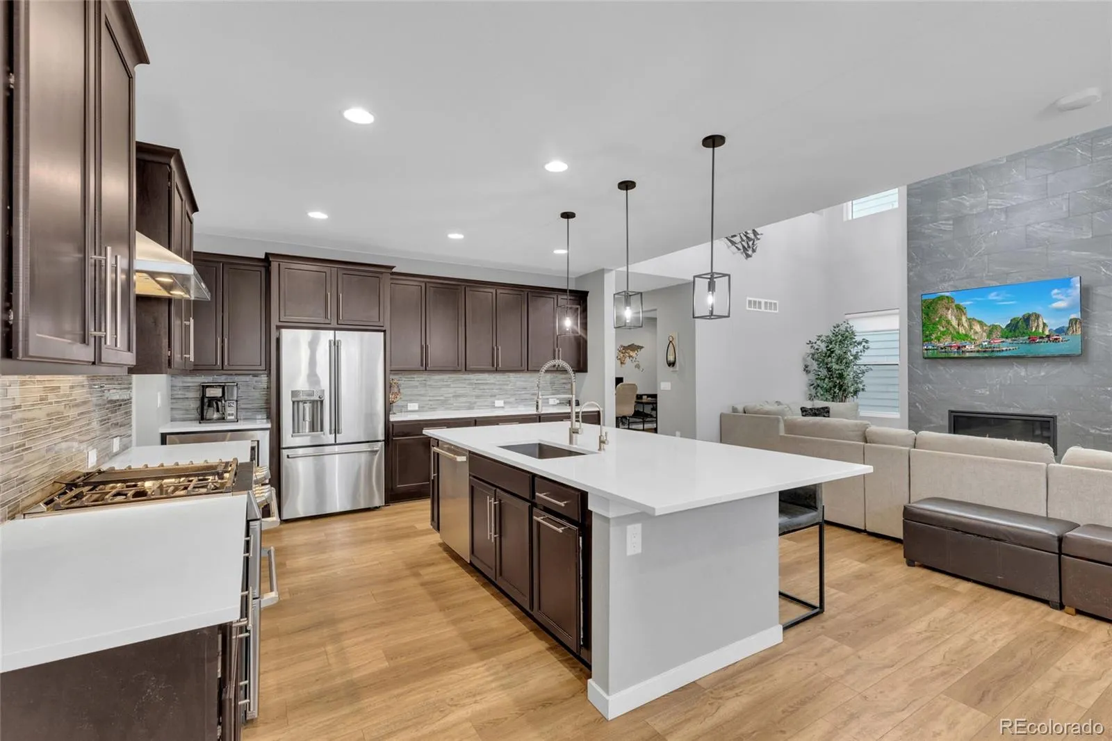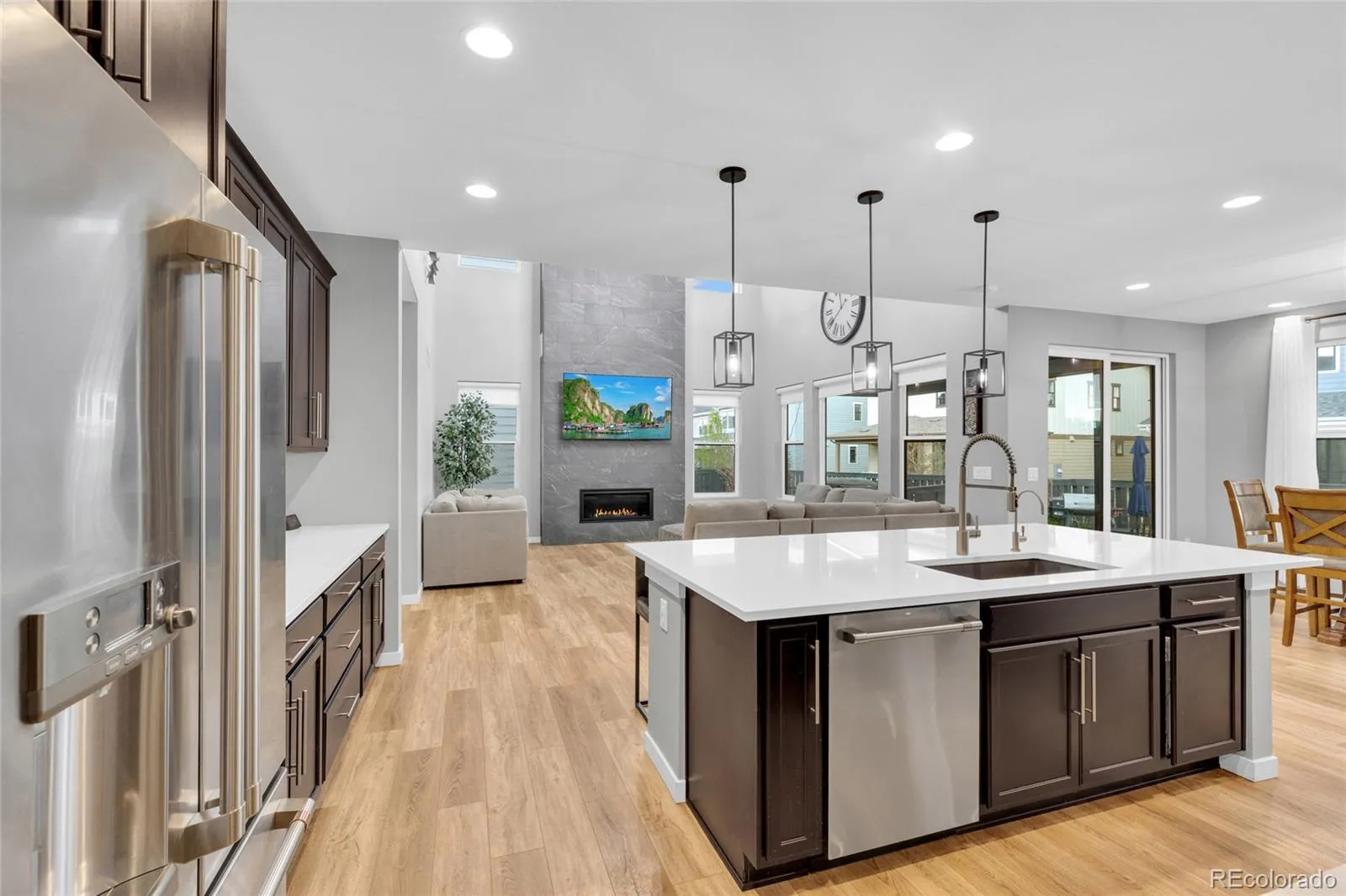 This thoughtfully designed home features soaring ceilings, 8-foot interior doors throughout, and expansive windows that flood the space with natural light, creating a bright and open feel from the moment you enter. The main level showcases wide plank flooring, upgraded lighting, and a stunning 20-foot tile fireplace feature wall that anchors the living space and creates a true focal point for both everyday living and entertaining.