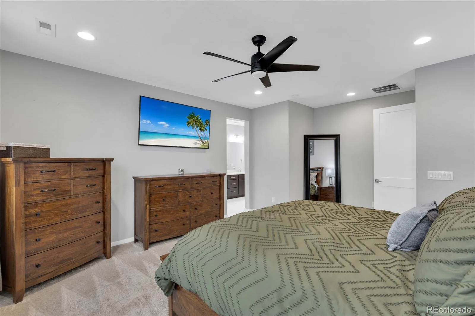 Upstairs, the spacious primary suite offers a private retreat with a spa-inspired bathroom designed for comfort, relaxation, and functionality. Additional upgrades throughout the home include upgraded carpet with enhanced padding, custom rod iron staircase spindles, and a whole-home water filtration system providing clean, high-quality water at every tap.