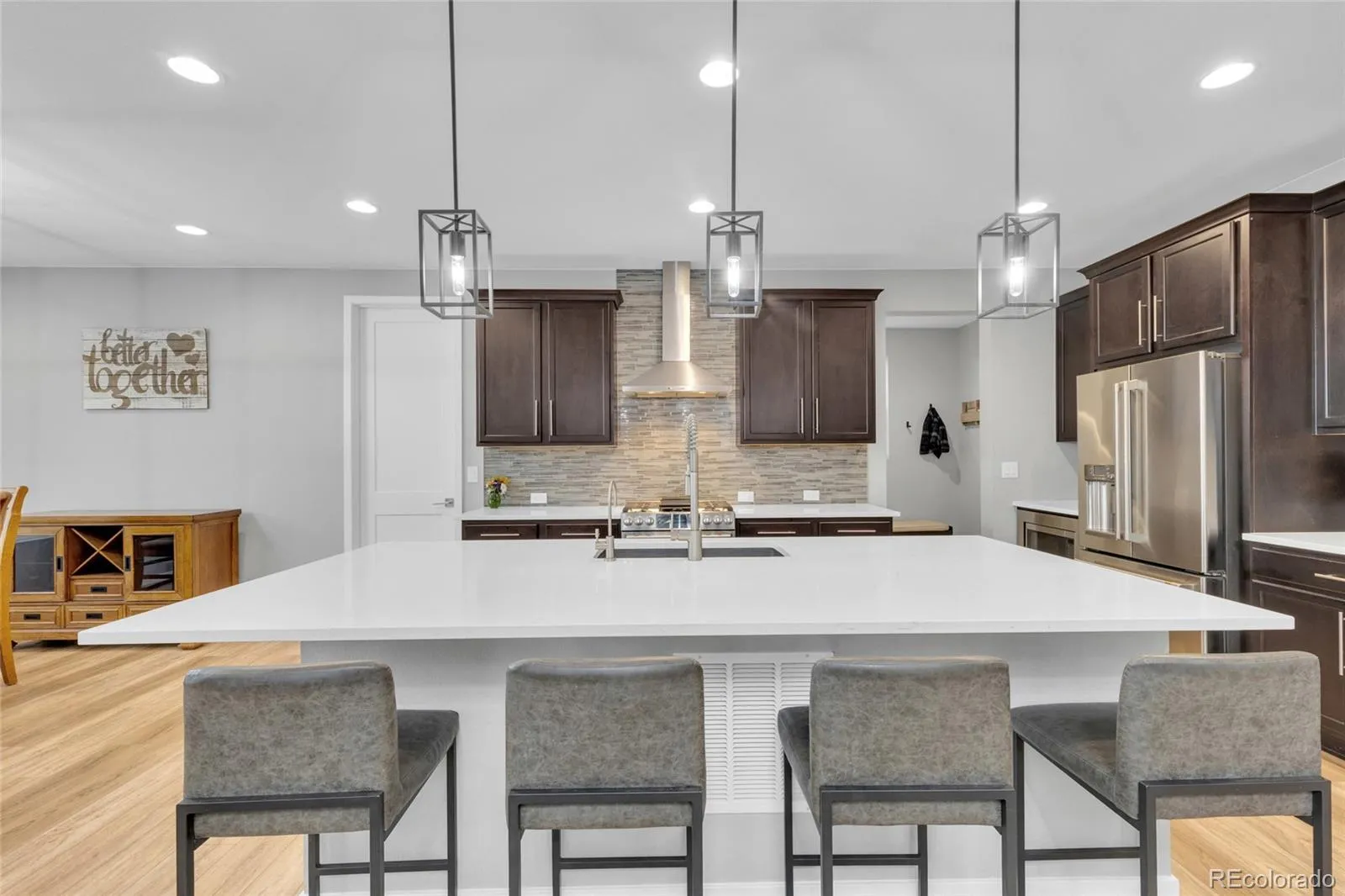 The upgraded kitchen is designed with both style and function in mind, featuring premium finishes, ample workspace, and a seamless flow into the dining and living areas—ideal for hosting or staying connected with family.