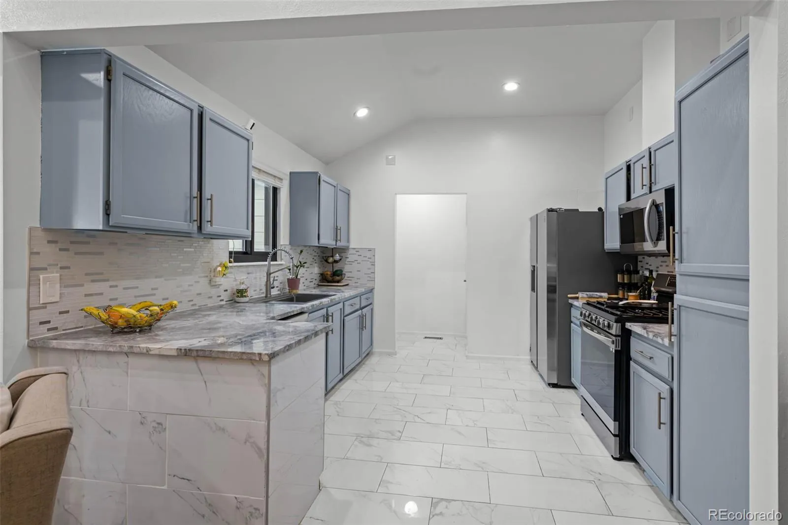 Extensive upgrades include a raised kitchen ceiling, popcorn ceiling removal, updated electrical panel, recessed lighting, upgraded outlets and switches, stylish door hardware, and newer wood-look laminate flooring throughout. The family room showcases a dramatic cathedral ceiling, and newer appliances—including washer and dryer—are included. A rare powder room off the kitchen adds extra convenience.