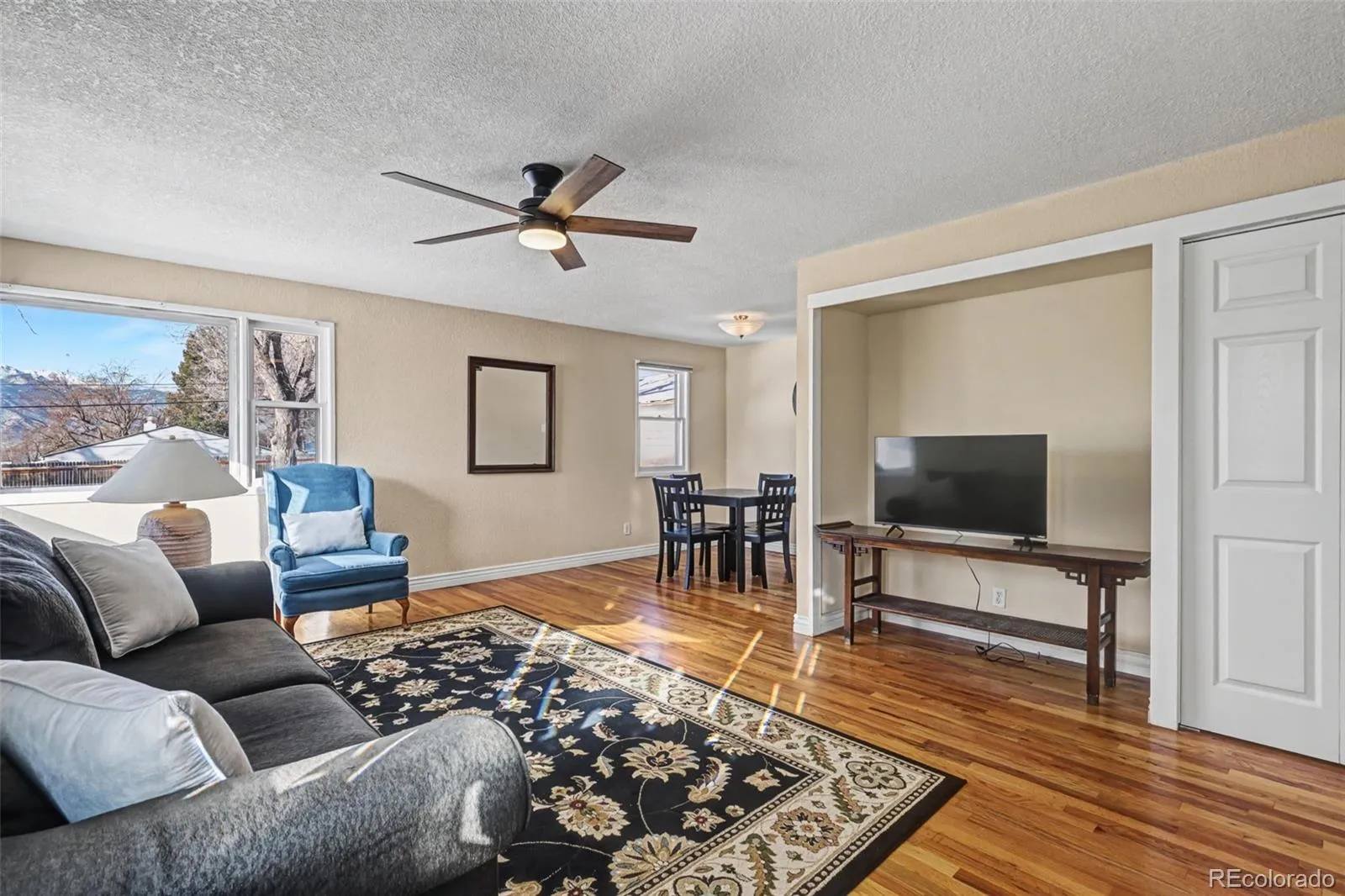 Welcome to this charming ranch-style home situated on just under a quarter-acre in a highly convenient, central Colorado Springs location. The fenced yard offers privacy and space, complemented by mature trees that create a peaceful outdoor setting. Enjoy easy access to shops, schools, grocery stores, military bases and local amenities, with the added benefit of being centrally located for effortless travel throughout the city. Inside, the home has been refreshed with new interior paint and updated ceiling fans in the living room and all three bedrooms. Upon entry, you’re greeted by a spacious, light-filled living room featuring beautiful natural light and stunning views of Pikes Peak and the Rocky Mountains. Hardwood floors flow throughout the home and are in excellent condition. The kitchen includes a refrigerator, dishwasher, disposal, and oven/range, and opens to a dedicated laundry room with washer and dryer included, along with ample storage space. The primary bedroom features hardwood flooring and a generous double-wide closet, while two additional bedrooms also offer hardwood floors and mountain views. A full bathroom includes tile flooring and a vanity with storage. Step outside to the spacious concrete back patio—ideal for relaxing or entertaining—surrounded by mature trees and tranquil views. Completing the property is a detached, oversized, drywalled one-car garage, providing additional storage or workspace. Make this centrally located, charming home yours!