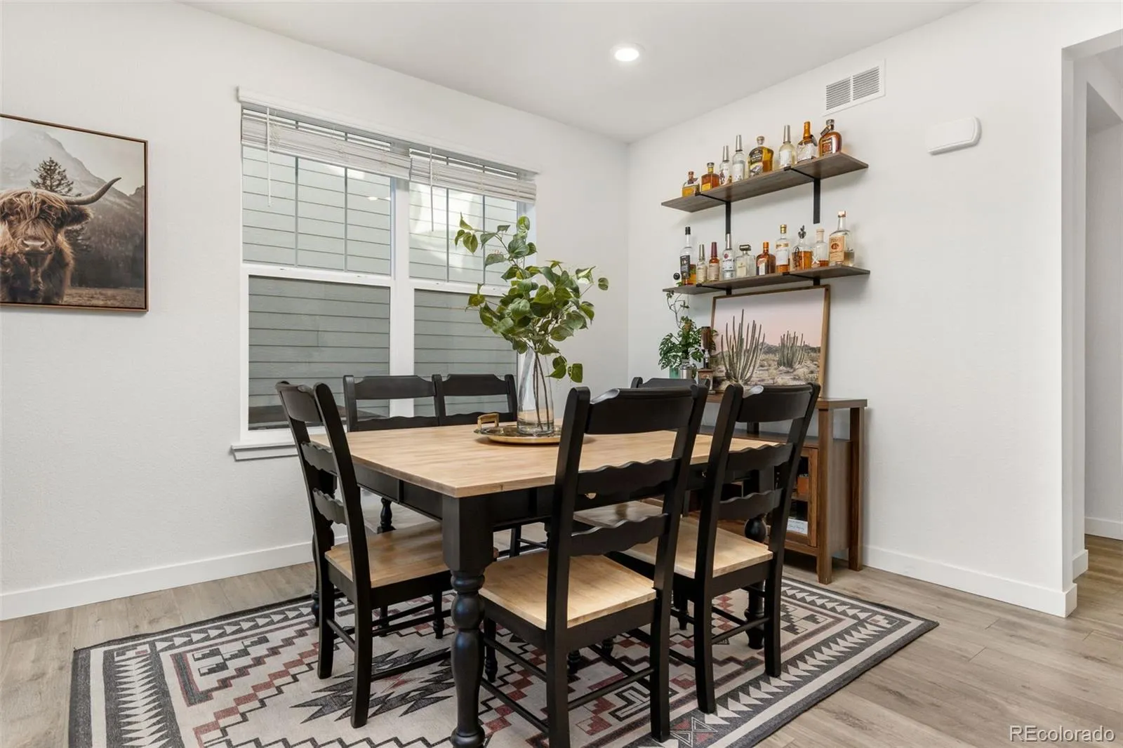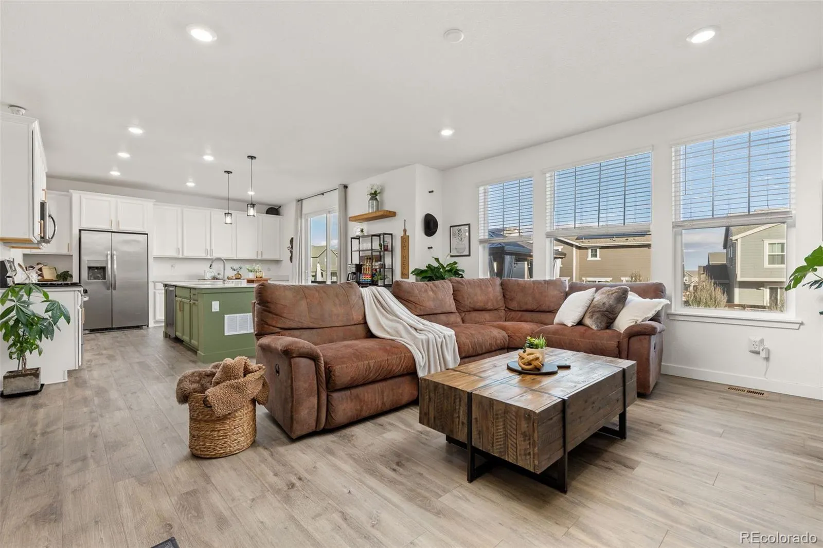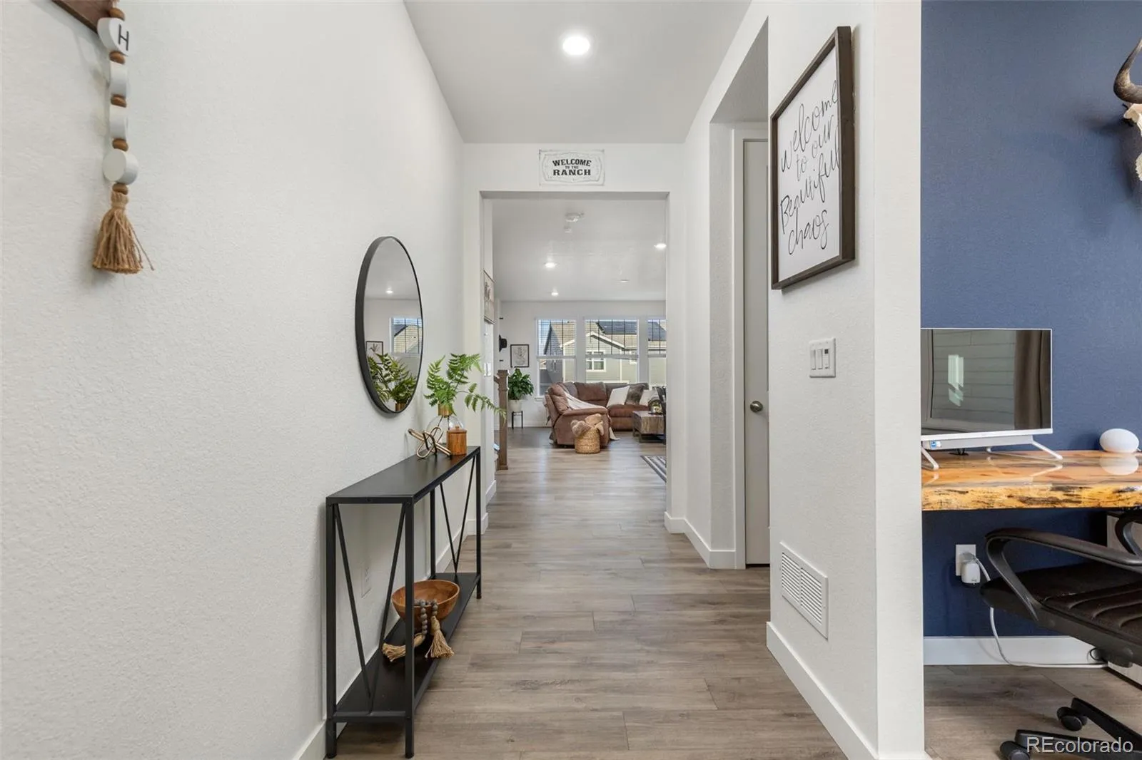 The main level features LVP flooring and an open layout with ample natural lighting. The kitchen includes quartz countertops, generous countertop space, a large kitchen island with custom pendant lighting, a pantry, and an eat in dining area that opens to the living room. The main level also includes an office with a built in desk and a quarter bathroom.