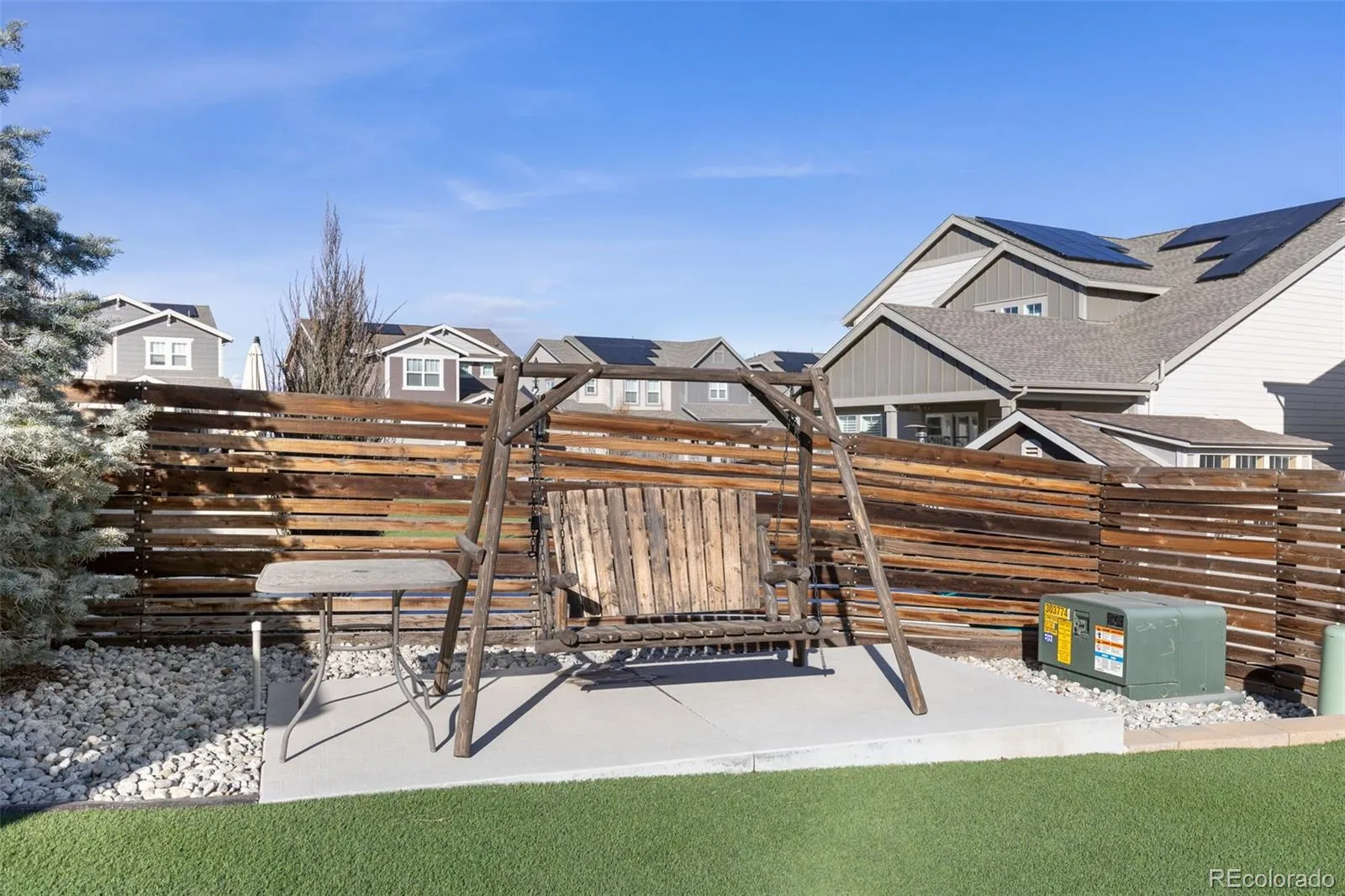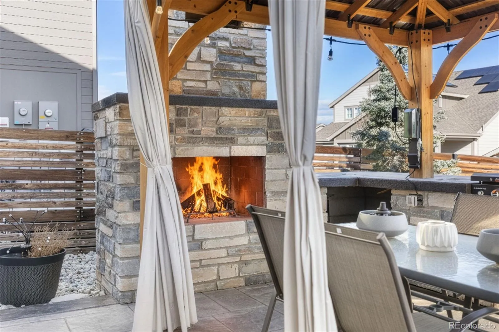 The exterior is a true highlight. A west facing covered front porch, expanded driveway, and 2 car expanded garage provide extra space and storage. The fully fenced backyard is designed for low maintenance and entertaining, featuring stamped concrete wrapping the home, turf, raised stone garden beds with drip irrigation, and a custom stone outdoor kitchen with a wood burning fireplace with a custom American flag accent above, Blackstone griddle, and gazebo with a TV. Additional features include a fire pit area, a shed pad with conduit in place, and a separate electrical breaker for the backyard.