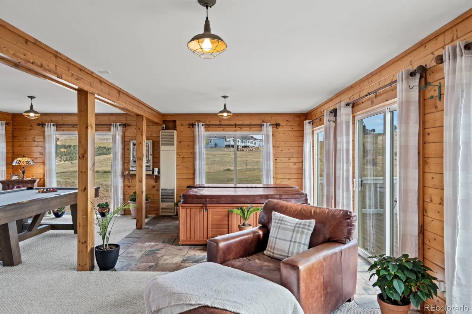 the home. Entertain in style with a massive living room, a game room complete with a dry bar, pool table, and hot tub, and