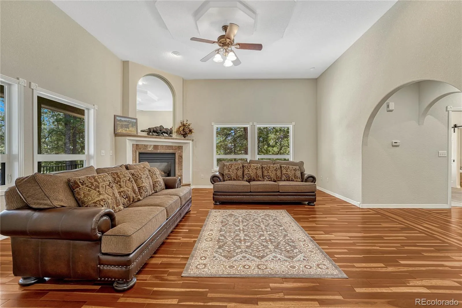 Nestled on a quiet private lot with ponderosa pines, this walk out ranch style home boasts many upgrades including rustic Brazilian cherry hardwoods, Travertine stone & LVP flooring, custom lighting fixtures, upgraded carpet, 12′ ceilings, striking gas fireplace surround, impressive grand entrance, and an inviting wrap around covered deck with awe inspiring views.