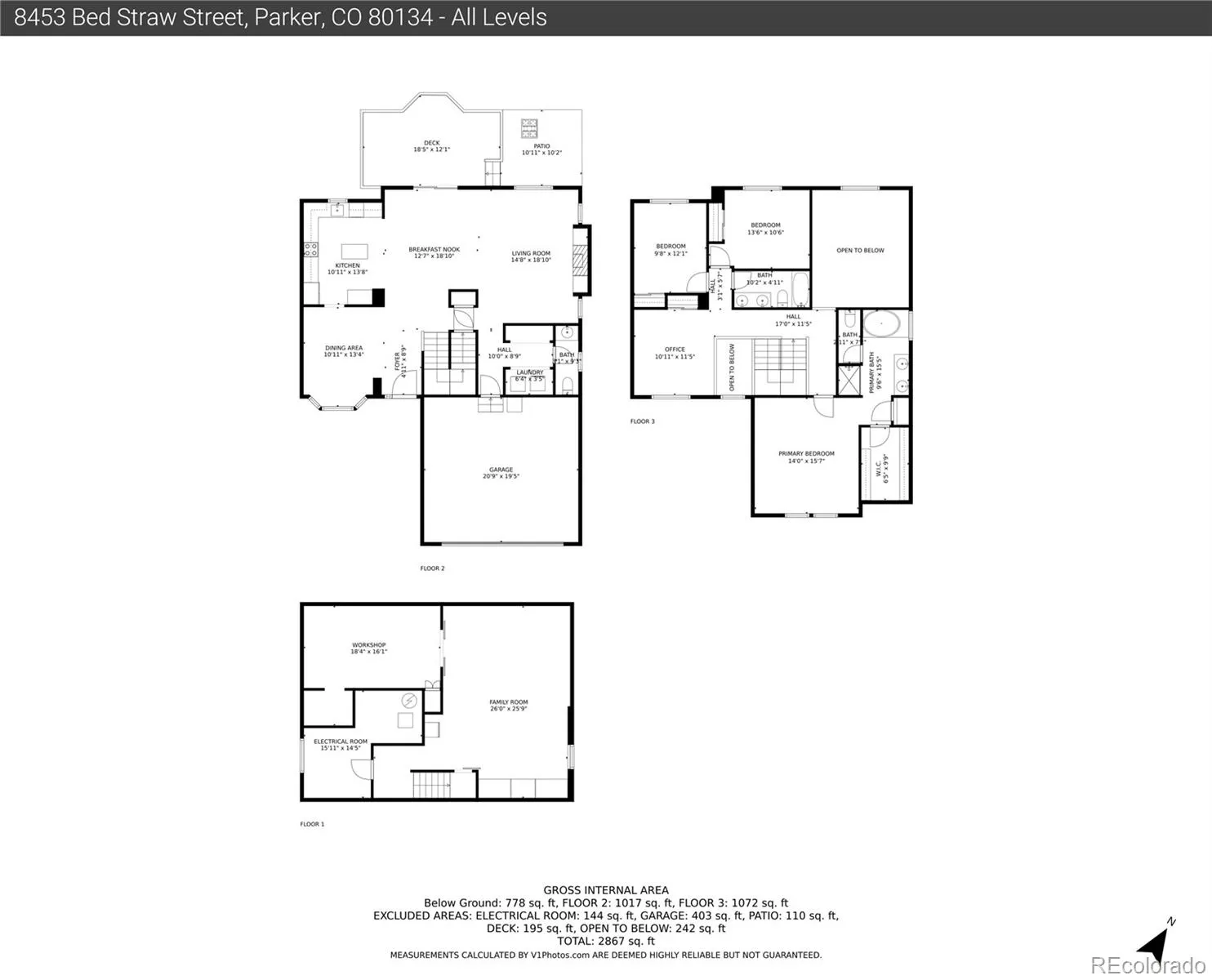 Welcome to this turnkey Parker property, where convenience meets comfort in a neighborhood offering quick access to metro conveniences and a great neighborhood park, as well as trail access for miles of outdoor fun! Convenient location for commuters throughout the metro area. Step inside this 3229 sq. ft., 4-bdrm, 2.5-bath haven and experience an open floor plan flooded with natural light. The modern interior boasts updates throughout, creating a welcoming atmosphere for both daily life and entertaining. The finished basement offers additional living space for your mancave, media room, or teenagers’ retreat! The fourth bedroom, converted to a workshop, adds versatility to the space and could easily be converted back to a bedroom! An office loft caters to your professional needs & could also be converted to a 5th conforming bedroom if needed. With an incredible entertainers’ deck, perfectly complementing the open floor plan, invite all your friends and family to your future holiday gatherings and summer BBQs! Outside, revel in a professionally landscaped oasis—a serene backdrop for relaxation. The property balances ease of maintenance with outdoor enjoyment. The NEW professionally built deck comes complete with an extendable awning which automatically retracts should the breeze start blowing! These sellers truly thought of everything. Complete with a NEW ROOF, GUTTERS, DECK, PROFESSIONAL LANDSCAPING, & EXTERIOR PAINT! As well as newer windows, appliances, and major systems. Professional landscaping includes inoculated trees and rose bushes, protecting your investment already. For those seeking both a haven and an entertainment hub, this house perfectly embodies the essence of open, updated living without sacrificing the convenience of modern metro life. Schedule your showing today!