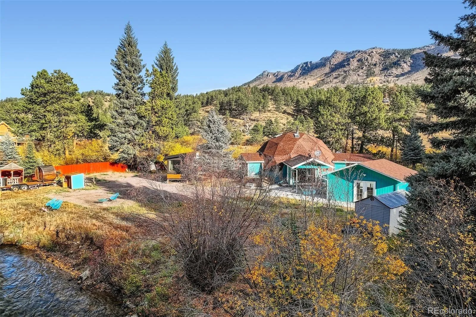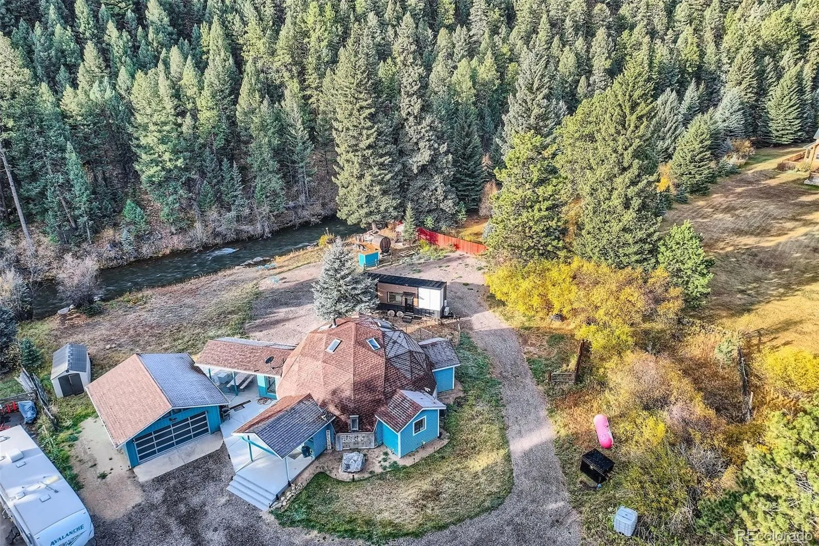 Rare Opportunity: Permitted Riverside Short-Term Rental & Architectural Gem. Experience the ultimate Colorado retreat at the Colorado River Dome Estate in Bailey. Situated on nearly one acre with 100 feet of private Gold Medal river access, this property is a proven asset—currently operating as a high-performing, permitted Short Term Rental with a Top 5% ranking and over 65 perfect reviews on Air BnB. The Main Residence (The Dome): A recently renovated (2024), 1,830 sq. ft. Mid-Century Modern geodesic dome. This designer-clad space features soaring ceilings and floor-to-ceiling folding sunroom doors that frame the mountain landscape. The chef’s kitchen is fully equipped with induction cooking and a Breville espresso machine. The layout includes a main-floor California King suite with rain shower, an attached bonus twin-bed room, a queen guest room, and a dramatic loft suite with a dedicated office nook. Two bedrooms have en suite 3/4 baths, one has a 3/4 bath just outside the door. The Studio Tiny Home: Overlooking the river, this separate dwelling offers a full kitchen, full bath with soaking tub, Murphy bed, and radiant floor heat—ideal for guest overflow or visitors. Entertainment & Wellness: The 2-car detached garage has been reimagined as the “Wandering Bear Den”—a 480 sq. ft. social hub featuring an 85” TV, arcade classics (NFL Blitz, pinball), and an Xbox. Outside, indulge in a 7-person saltwater hot tub, riverside electric cedar barrel sauna, and a stainless-steel Japanese soaking tub. Prime Location: Skip the I-70 traffic. Located less than an hour from Denver and Breckenridge, 10 minutes to local food & shopping, and only minutes to local food, drinks, shopping & hiking, as well as to world-class wedding venues like Deer Creek Valley Ranch. Turn-Key Status: Available fully furnished with active permit, established rental history, and 30MB Wi-Fi—perfect for a seamless transition. This property has only been on the market once in the past 35 years!