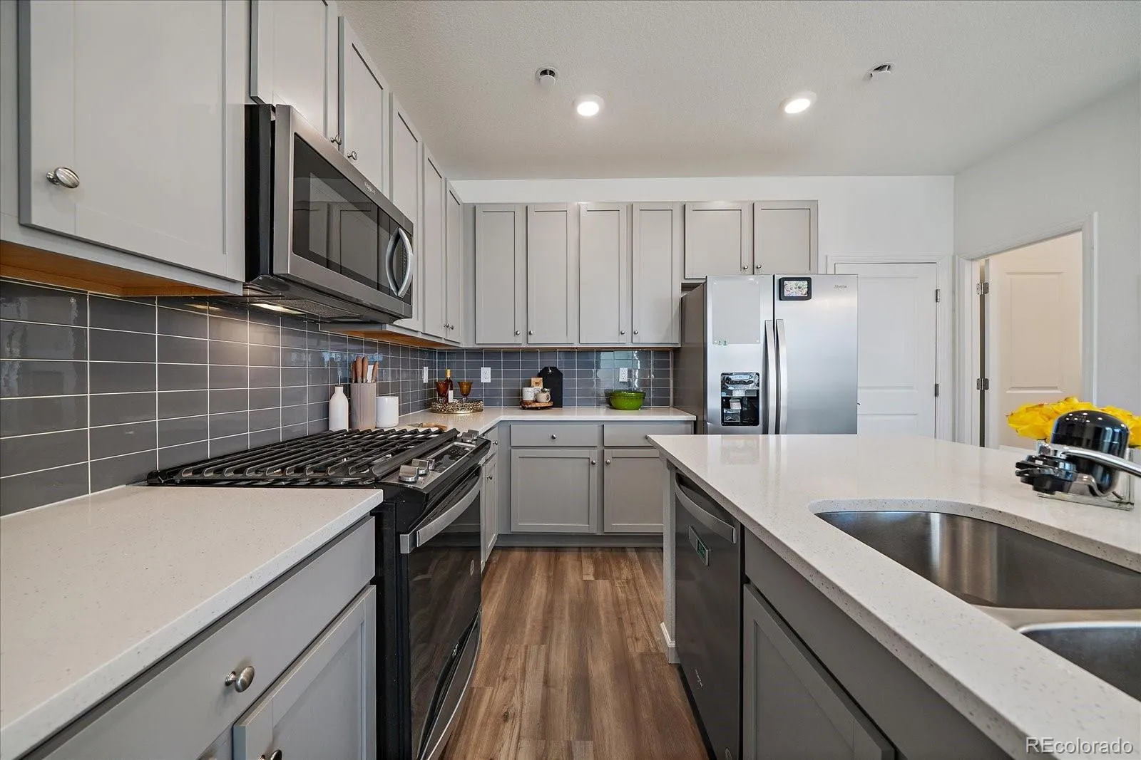 Built in 2023 and better than brand new, this move-in-ready townhome in Parker’s Anthology neighborhood pairs modern style with smart functionality throughout. The open-concept layout features luxury vinyl plank floors, a sleek tile-wall gas fireplace with custom changing colors, and east-facing windows that fill the space with morning light. The kitchen delivers a polished look with quartz countertops, tile backsplash, a gas range, Whirlpool appliances, and a roomy pantry plus a large eat-up island that is great for entertaining. Upstairs, you’ll find three comfortable bedrooms with upgraded remote-controlled Hunter ceiling fans in each room, a generous primary suite with an upgraded waterfall shower, dual sinks, an upstairs laundry room, and an upstairs landing that works perfectly as a small office or study space, plus custom blinds throughout for privacy and light control. Smart-home features include a smart garage door opener, smart thermostat, and security system through Alarm.com, plus a tankless water heater with pressure reducer for efficient comfort. Solar panels through ION help offset utility costs and support long-term energy savings, and there’s a rare bonus: a roomy crawl space that adds valuable extra storage. A two-car attached garage, fenced front yard (ideal for pets), and HOA that maintains landscaping in common areas keep day-to-day living simple, and a VA assumable loan creates an additional opportunity for the next buyer. Anthology offers a community pool, clubhouse, playground, and trail network, giving you plenty of options to get outside without leaving the neighborhood. On Parker’s west side, you’re a short drive to downtown Parker’s historic main street, local restaurants, coffee shops, and year-round events. Nearby recreation options like the Parker Recreation Center and PACE Center add classes, concerts, and cultural events to your weekly routine while the Rueter-Hess Reservoir is less than 10 minutes away. Visit YourParkerHm.com