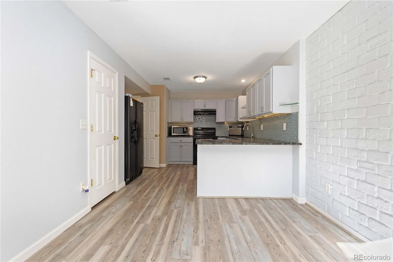 Charming end-unit townhome backing to prime open space in a quiet, desirable Brighton community—an incredible opportunity you won’t want to miss. This two-story townhome-style condo features an attached one-car garage and a private covered entry porch that opens to a spacious covered patio, perfect for morning coffee or outdoor dining. Inside, the bright and sunny interior is enhanced by new wood-grain luxury vinyl flooring, a cozy fireplace, and a soft, neutral color palette that complements the abundant natural light. The open dining and kitchen area is both stylish and functional, highlighted by a white brick accent wall and an updated chef’s kitchen with dark granite countertops, a peninsula island with seating, and classic subway tile backsplash. Upstairs, the primary suite offers a walk-in closet and a well-appointed en-suite bath with a large walk-in shower and updated vanity. A comfortable secondary bedroom and full bath feature the same modern finishes, creating a cohesive and inviting space. Enjoy the convenience of a one-car attached garage plus an additional reserved parking space. The beautifully maintained community offers mature landscaping, a recently replaced roof, and resort-style amenities including a pool, hot tub, clubhouse, and fitness center—just steps from your door. Ideally located near trails, parks, playgrounds, dining, and only minutes from Barr Lake State Park. Welcome home.