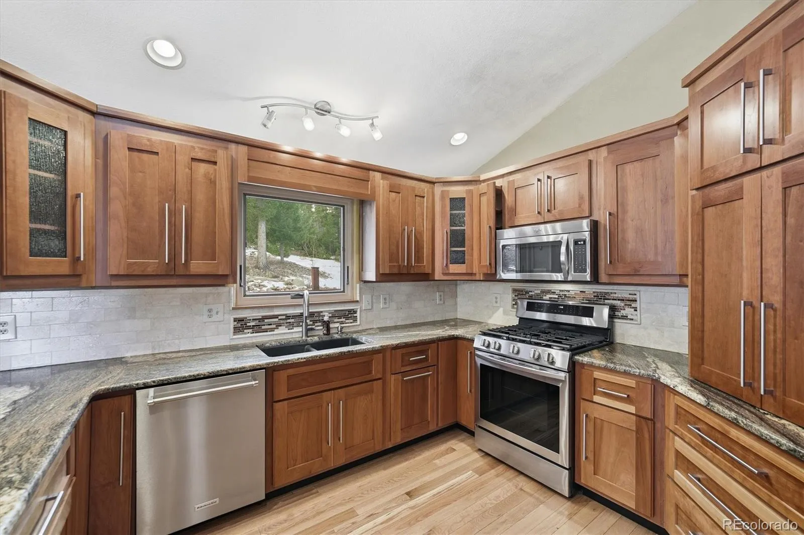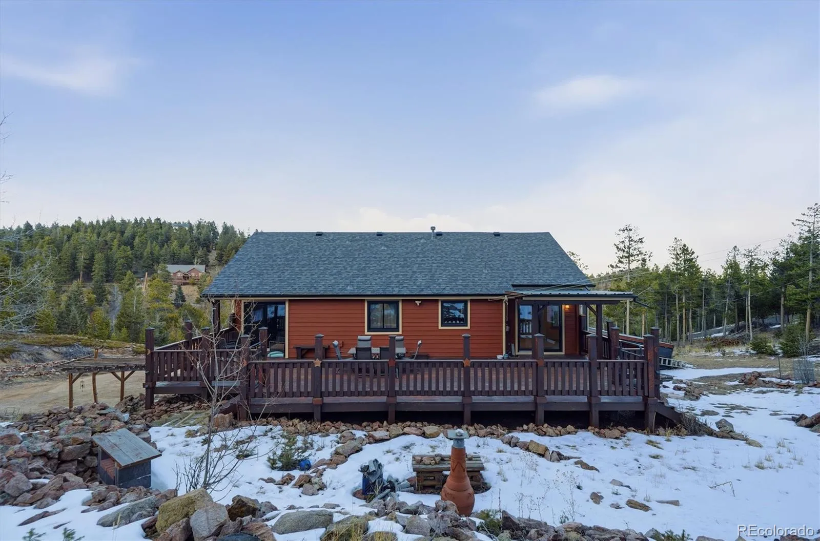 THE BEST MOUNTAIN HOME WITH MILLION DOLLAR VIEWS AT THIS PRICE POINT! Serene location at the top of desirable Brook Forest abutting hundreds of acres of undeveloped forest and only 15 minutes to Downtown Evergreen. Drenched in natural light with views out every window and spectacular sunrises and sunsets. Vaulted ceilings, picture windows, hardwood floors, gorgeous remodeled kitchen with cherry cabinets, granite counters, natural gas stove and expansive storage. Primary bedroom with 5-piece en-suite bath + 2 bedrooms on upper level. Sliding glass doors in primary and kitchen/dining open to back deck. Main level walk-out has family room, office/den/man-cave/4th non-conforming bedroom, 3/4 bath, 10 foot ceiling, 3-panel sliding glass doors to patio, and garage access. East facing front deck and expansive, fenced-in west facing back deck off the kitchen/dining room for hot tub, family dinners and entertaining. Gas fireplace in living room and soapstone wood burning stove in main-level family room. Huge 750 sq ft drywalled/insulated garage with built-in workbench and TONS of storage, plus 200 sq ft shed with loft next to driveway. Lilac bushes and tiered gardens with moss rock walls. Plenty of room for your camper/trailer and parking for several cars. Snow melts quickly on south facing driveway. Many major improvements including: gorgeous remodeled kitchen, new Class 4 hail resistant roof (2022), new hot water heater (2022); exterior painted (2023); new soapstone wood burning stove (2021), new high-end wood Anderson windows and 3 sliding glass doors (2022), whole property fire mitigation (2025). This home is on natural gas, a rarity in mountain homes and cheaper & easier than propane. Whole house water filtration system, hardwired internet, no HOA.