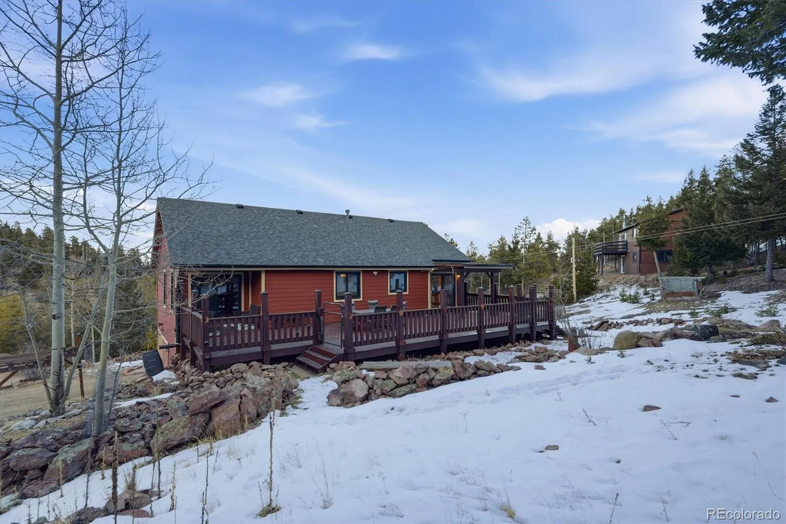 Top of the world and only 15 minutes to town! At the end of the road abutting hundreds of acres of forest. Drenched in natural light with spectacular top-of-the-world sunrise views. Vaulted ceilings, picture windows, wide-plank hardwood floors, gorgeous remodeled kitchen with cherry cabinets, granite counters, natural gas stove and expansive storage. Primary bedroom with 5-piece en-suite bath + 2 bedrooms on upper level. Sliding glass door in primary opens to back deck, which has been reinforced to accommodate a hot tub. Main level walk out has family room, office/den/man-cave/4th non-conforming bedroom, 3/4 bath, 10 foot ceiling, 3-panel sliding glass doors to patio, and access to garage. East facing front deck and expansive west facing back deck off the kitchen/dining room for family dinners and entertaining. Gas fireplace in living room and soapstone wood burning stove in main-level family room. Current owners have only used the wood stove to heat the house (though furnace is in excellent working condition). Approximately 5 chords of wood included with sale. Huge 750 sq ft drywalled, insulated and heated garage with built-in workbench and TONS of storage. Lilac bushes and beautiful tiered gardens with moss rock walls. A well-built, 200 sq ft storage shed with loft located next to the driveway provides even more storage. Plenty of room for your RV/trailer and the driveway accommodates parking for many cars. Snow melts quickly on the south facing driveway. Road is plowed by the County all the way up to where the pavement ends. New soapstone wood burning stove (2021), new high-end wood Anderson windows and 3 sliding glass doors (2022), new hail resistant roof (2022), new hot water heater (2022); exterior painted (2023). Whole house water filtration system. Hardwired internet. No HOA.