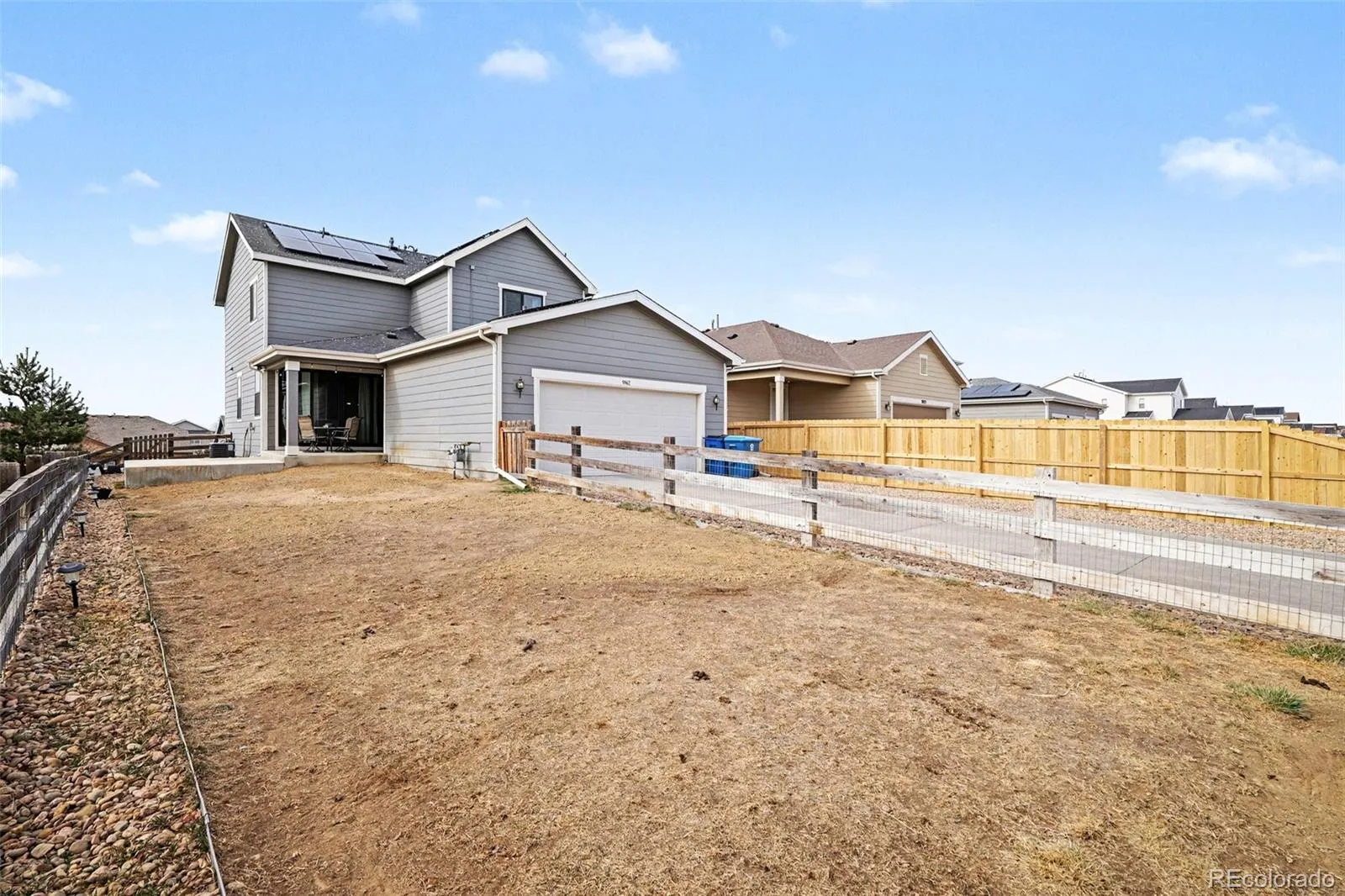 This energy-efficient home includes solar panels to help reduce utility costs. The backyard provides a comfortable outdoor space for relaxing, gardening, or play.