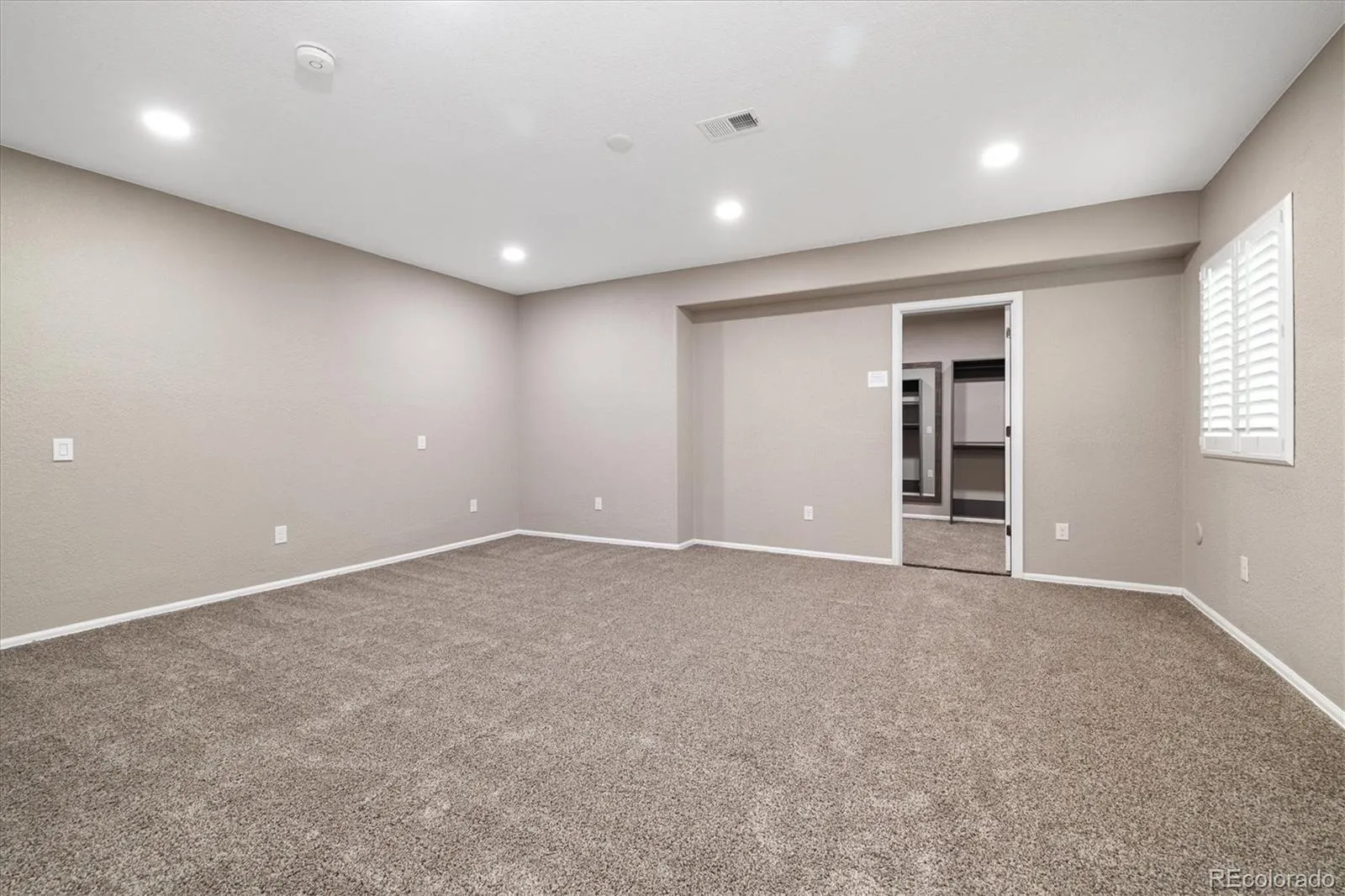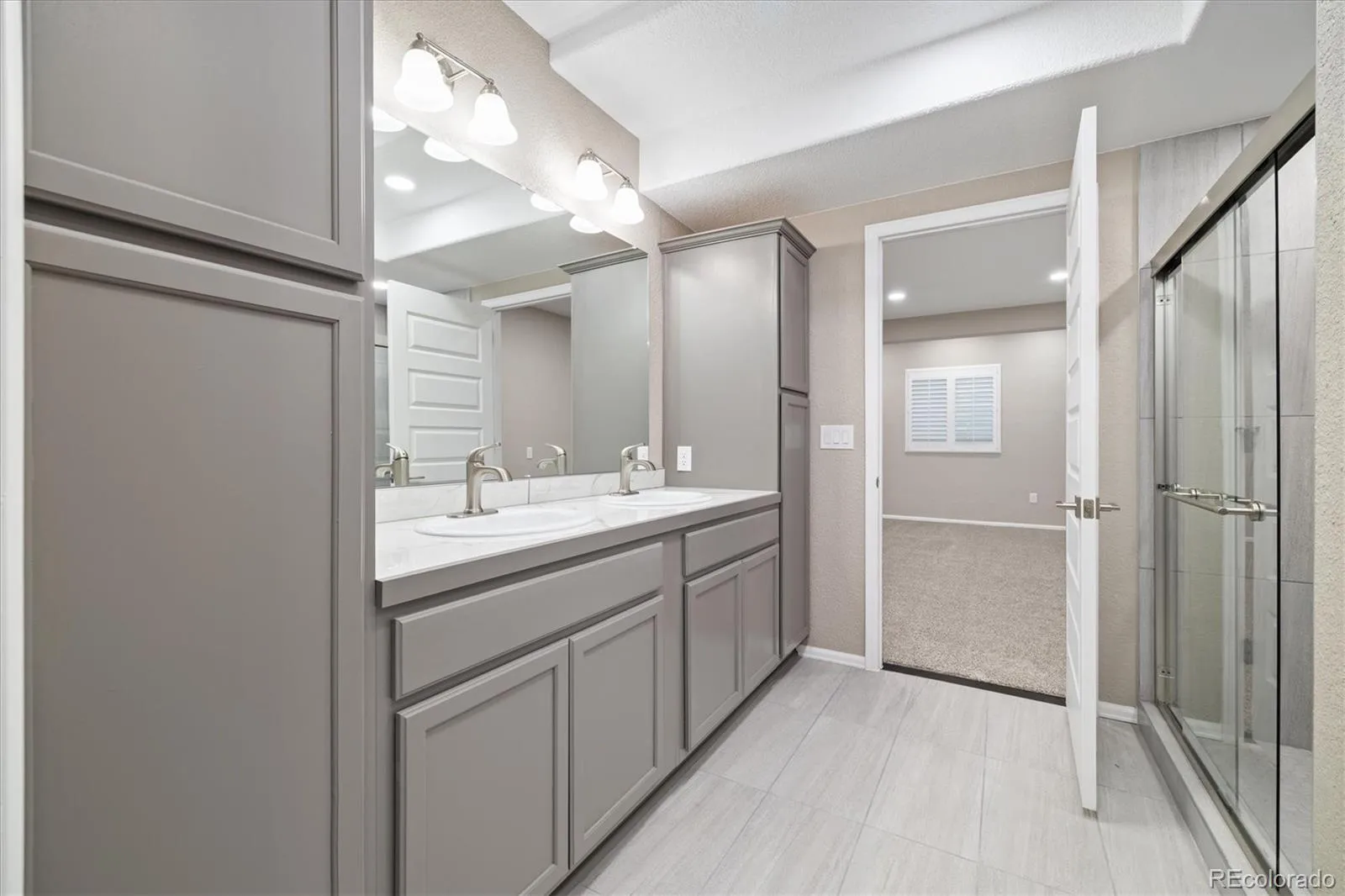 The living room showcases a linear gas fireplace, plantation shutters, recessed lighting, electric shades, and a dramatic 20-foot glass slider that opens to a private patio backing to open space. The main-floor primary suite offers a custom closet and a spa-like bath with double sinks and an oversized glass shower.