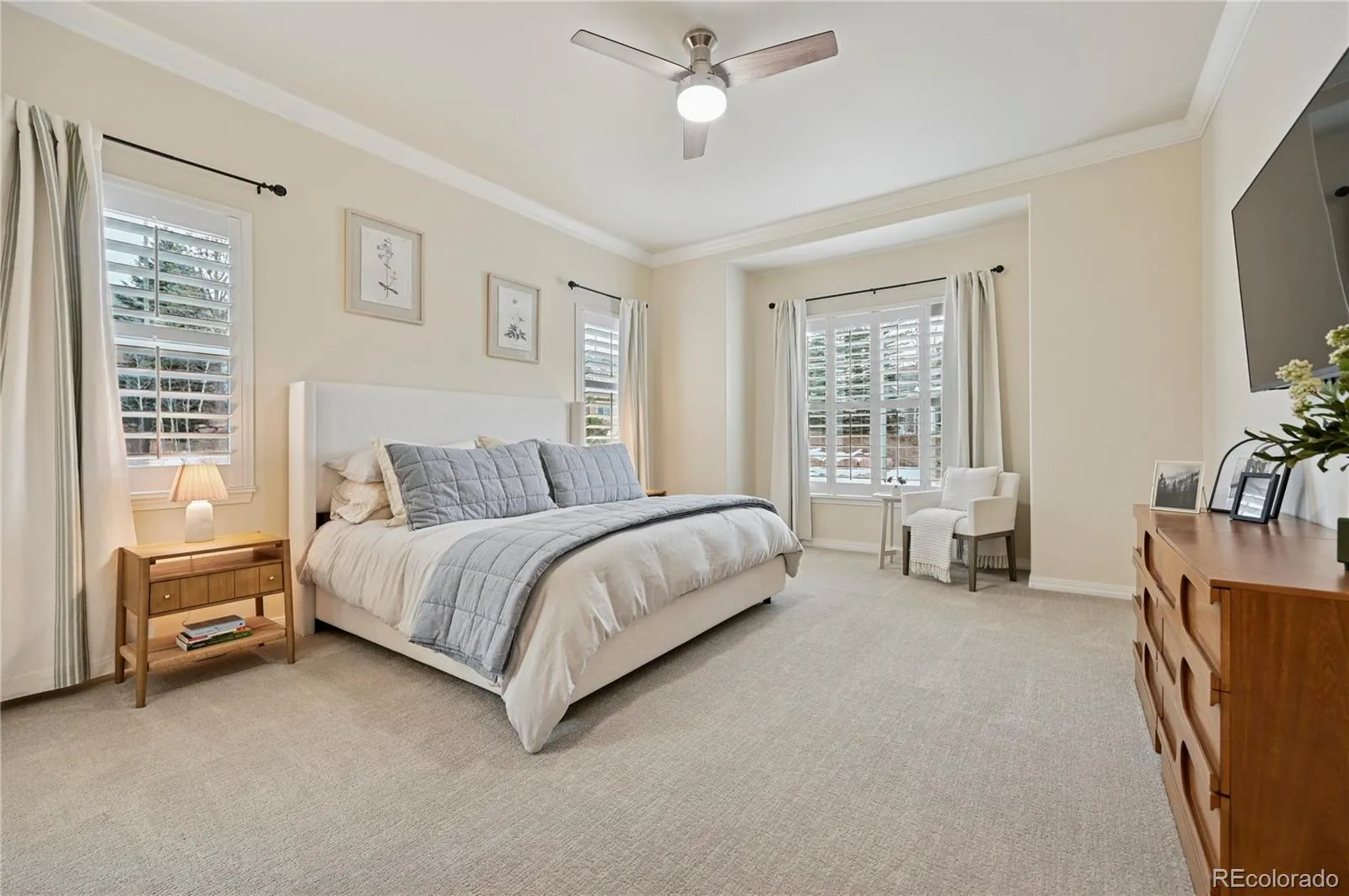 Welcome home! This Keller built home boasts a generous covered front porch at the entry and welcomes you with refinished hardwood floors that walk you throughout the main floor, kitchen and dining. This beautiful Pine Creek home offers exceptional living in one of Briargate’s most desirable golf course communities! Ample natural light through a wall of windows warms and welcomes you into stretching dining area and main floor living room, with 15 ft vaulted ceilings and crown molding, and anchored by gas fireplace with stone hearth chimney. The beautiful kitchen is showcased by an extra large island with bar seating, surrounded by white 42 inch cabinets, and is designed for both everyday living and effortless entertaining. Thoughtful upgraded finishes include showcase white cabinetry and built-ins, Blanco sink, upgraded Bosch appliances, and Jenn-air gas cooktop, offering the ideal space for hosting large gatherings. Dedicated laundry space with utility sink offers convenience on the main floor. Retreat to the primary suite with crown molding and new carpet, you’ll enjoy the private ensuite 5pc bathroom with two way gas fireplace, garden tub, generous primary closet with custom organizers. Head downstairs and enjoy a third gas fireplace to cozy up for movies in spacious great room, the perfect spot for relaxation. Additional basement purposed spaces include excercise area with mirrored wall, private office space, 3 large bedrooms, 2 full bathrooms. 4-car garage boasts AMPLE custom storage cabinetry, workshop with tool pegboard, shoe cubby station and epoxy finish floors. Large cul-de-sac lot shows off level green lawn, mature trees, and cozy covered patio with french doors to fully enjoy beautiful Colorado weather. New paint throughout, and new furnace in 2022. Blending luxury and comfort into modern upgrades for convenient main floor living in perfect location near hospitals, shopping, and neighborhood parks, with easy commute anywhere in Colorado Springs.