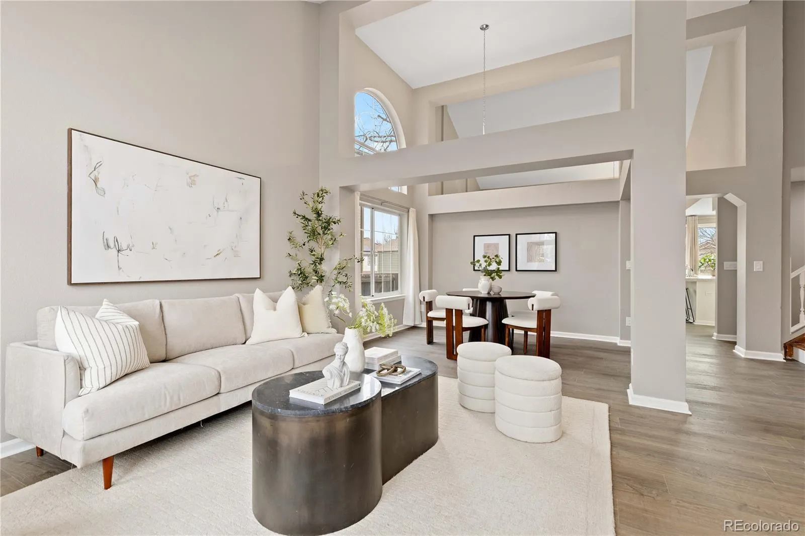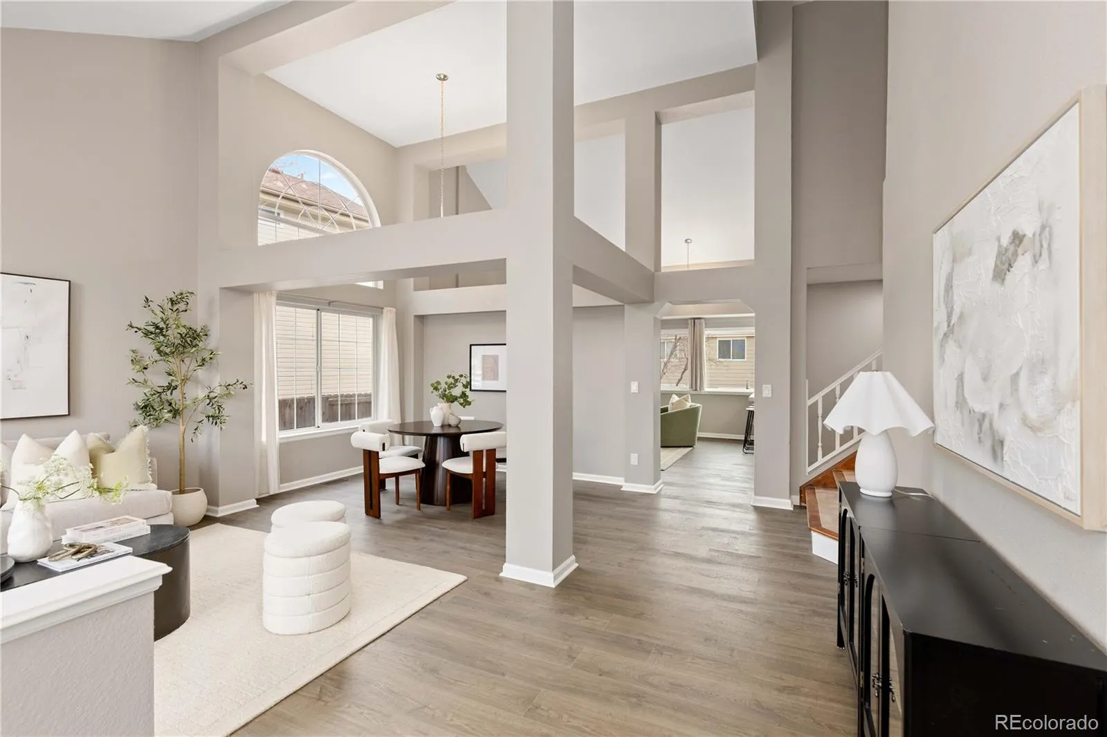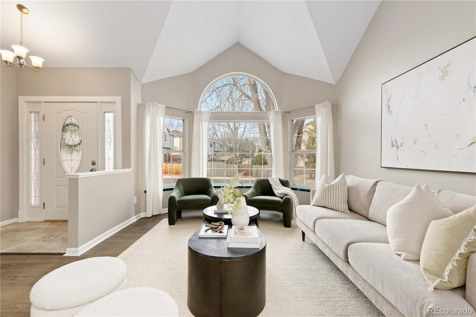 Nestled in the beautiful Torrey Peaks neighborhood of Westminster, this inviting home offers exceptional curb appeal, with large mature trees setting a welcoming tone from the moment you arrive. Step inside to a bright and airy main living space featuring soaring vaulted ceilings, expansive windows that flood the home with natural light, and a crisp, neutral color palette that feels both modern and timeless. The formal living room and dining room sit at the front of the home, perfect for entertaining or everyday living.