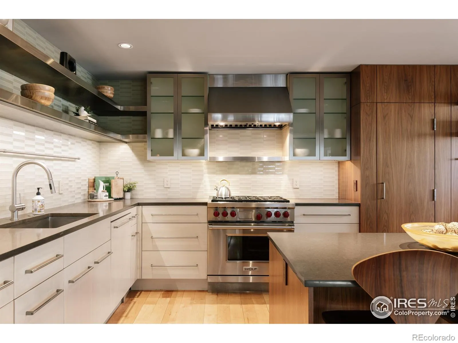 Privately positioned on 0.57 acres behind a dramatic, illuminated gated driveway, this architecturally distinguished estate, renovated by Harvey Hine, reflects a refined mid-century modern aesthetic and offers a sophisticated balance of timeless design, privacy, and effortless livability. An oversized pivoting wood door provides an elegant introduction to the home. The living room features a vaulted ceiling, a statement tiled fireplace, and maple hardwood floors, while large windows and glass doors create a natural connection to the elevated rear deck, ideal for entertaining or quiet evenings at home. The chef’s kitchen blends mid-century-inspired warmth with modern performance, featuring custom walnut cabinetry, a dramatic waterfall stone island, designer tile backsplash, walk-in pantry, Wolf range, and Sub-Zero refrigeration. A refined library lounge transitions to a flexible office or fifth bedroom with direct access to the front patio. The main-floor primary suite offers a serene retreat with a generous walk-in closet and spa-inspired bath, allowing for luxurious single-level living. The fully finished lower level includes a media lounge and private guest suite, with architectural renderings available to reimagine the space as a wellness retreat. Outdoors, the grounds unfold as a secluded oasis with towering 50-foot evergreens, natural boulders, a stone patio, a seasonal water feature, and multiple intimate seating areas. A heated bonus studio provides exceptional flexibility as a gym, art studio, or private office. With its scale, privacy, and layout, the property also presents compelling Sundance Film Festival 2027 rental potential. Ideally located on one of the most desirable streets in coveted Newlands, just minutes to downtown Boulder, open space, trails, shops, and schools. Explore the 3D tour and property video.