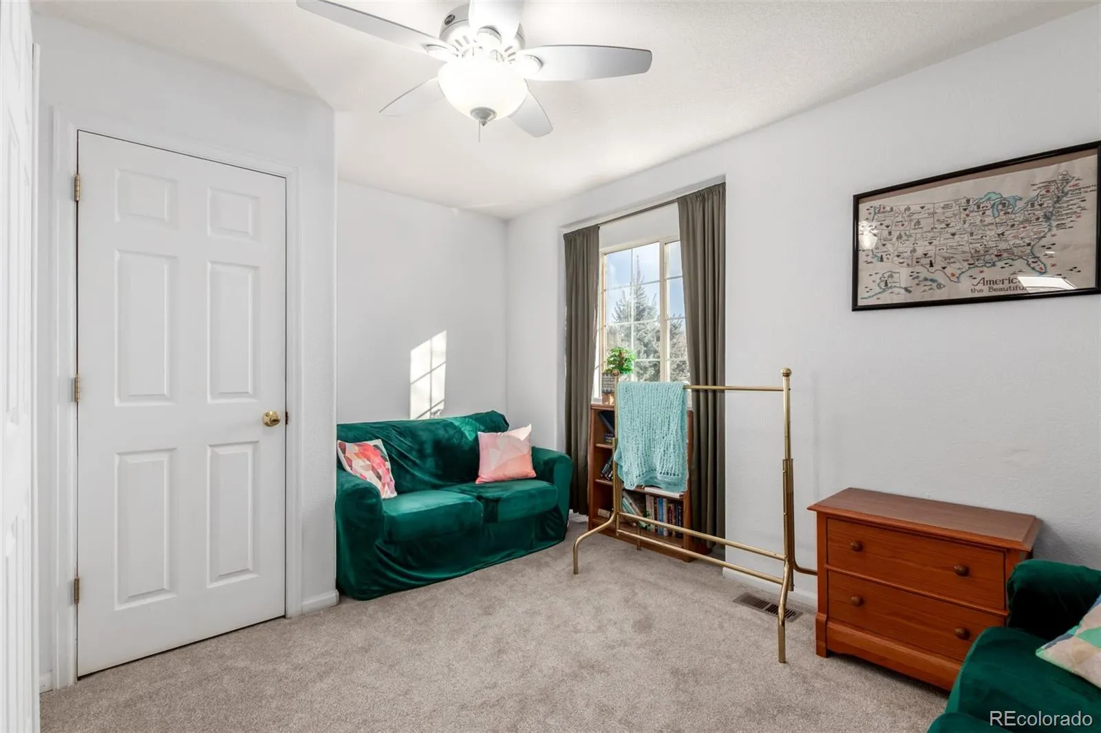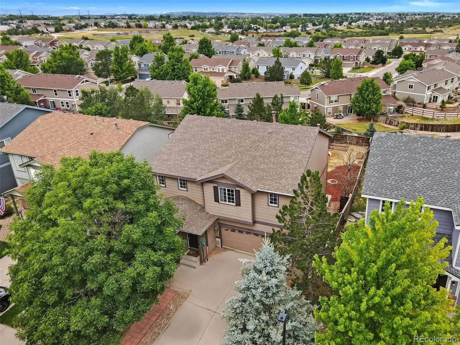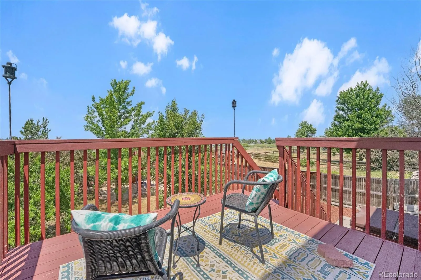 A raised deck extends the living space outdoors and captures expansive westerly views. Open space located a few homes away is visible from the deck, contributing to a more open outlook. Evening light and mountain-facing views provide the setting for colorful Rocky Mountain sunsets. The yard offers space for outdoor use while maintaining proximity to nearby trail systems and neighborhood parks.