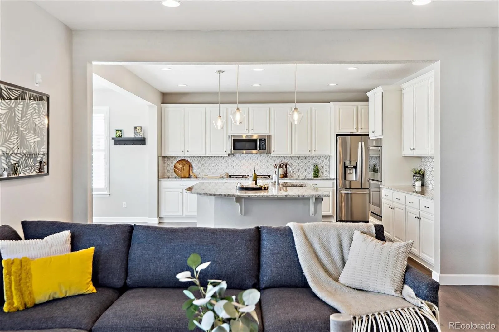 The spacious foyer with a wide hallway welcomes you into the sunny Great Room with an open-concept layout that flows into the stunning kitchen and dining space. A covered patio for dining al fresco and entertaining makes it easy to enjoy the Colorado indoor/outdoor lifestyle! The gourmet kitchen showcases a striking, over-sized island which seats 6 comfortably. Stainless steel appliances, and a custom-designed walk-in pantry, along with an incredible amount of storage space in upper, lower and island cabinetry offer extra convenience and value.