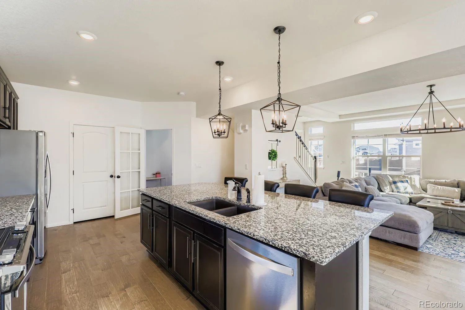 The second floor is the heart of the home and showcases an open, light-filled living space. The kitchen is a standout with a large island, granite countertops, and stainless steel appliances. Just off the dining area, sliding glass doors lead to the deck—perfect for grilling and entertaining. The great room is bright and inviting with large windows, while an additional bonus space on this level offers the ideal spot for a home office. A powder bath is conveniently located just a few steps up.