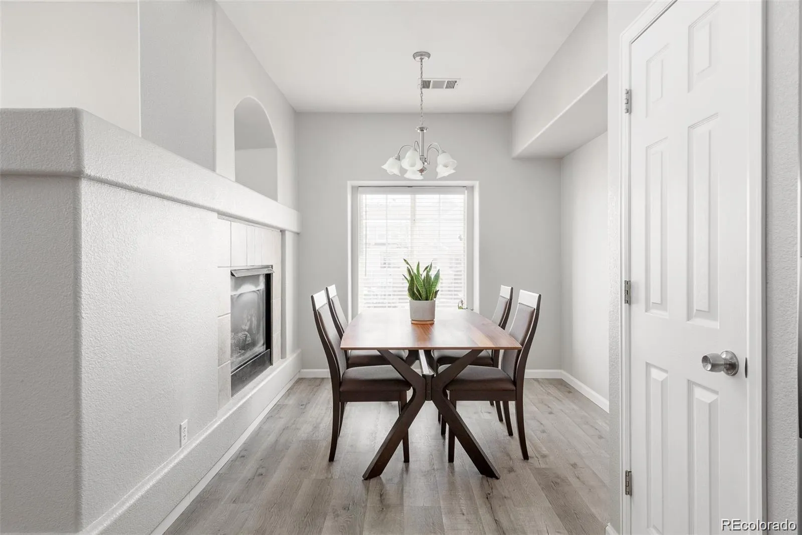 windows and a cozy dual-sided gas fireplace that flows seamlessly into the formal dining area. The kitchen features freshly