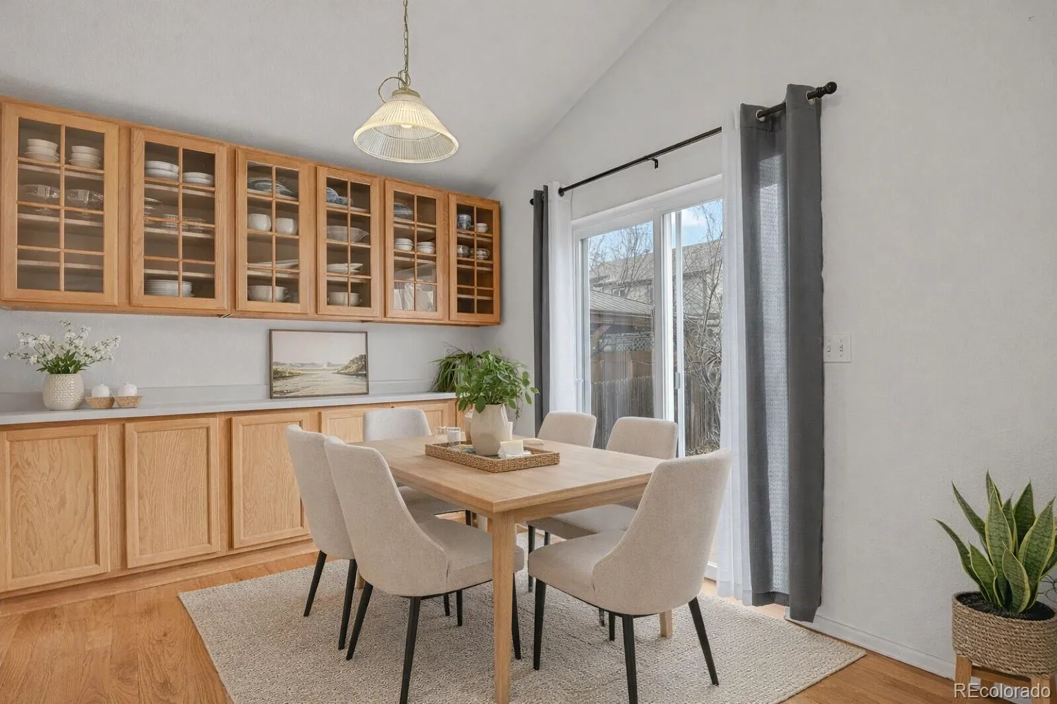 The main level features hardwood floors, abundant natural light, and an open-concept layout connecting the living, dining, and kitchen spaces. The kitchen offers ample cabinetry, generous counter space, stainless steel appliances, and room for an everyday dining table, in addition to a separate dining room. Sliding glass doors open to the backyard and concrete patio, creating easy indoor-outdoor living.