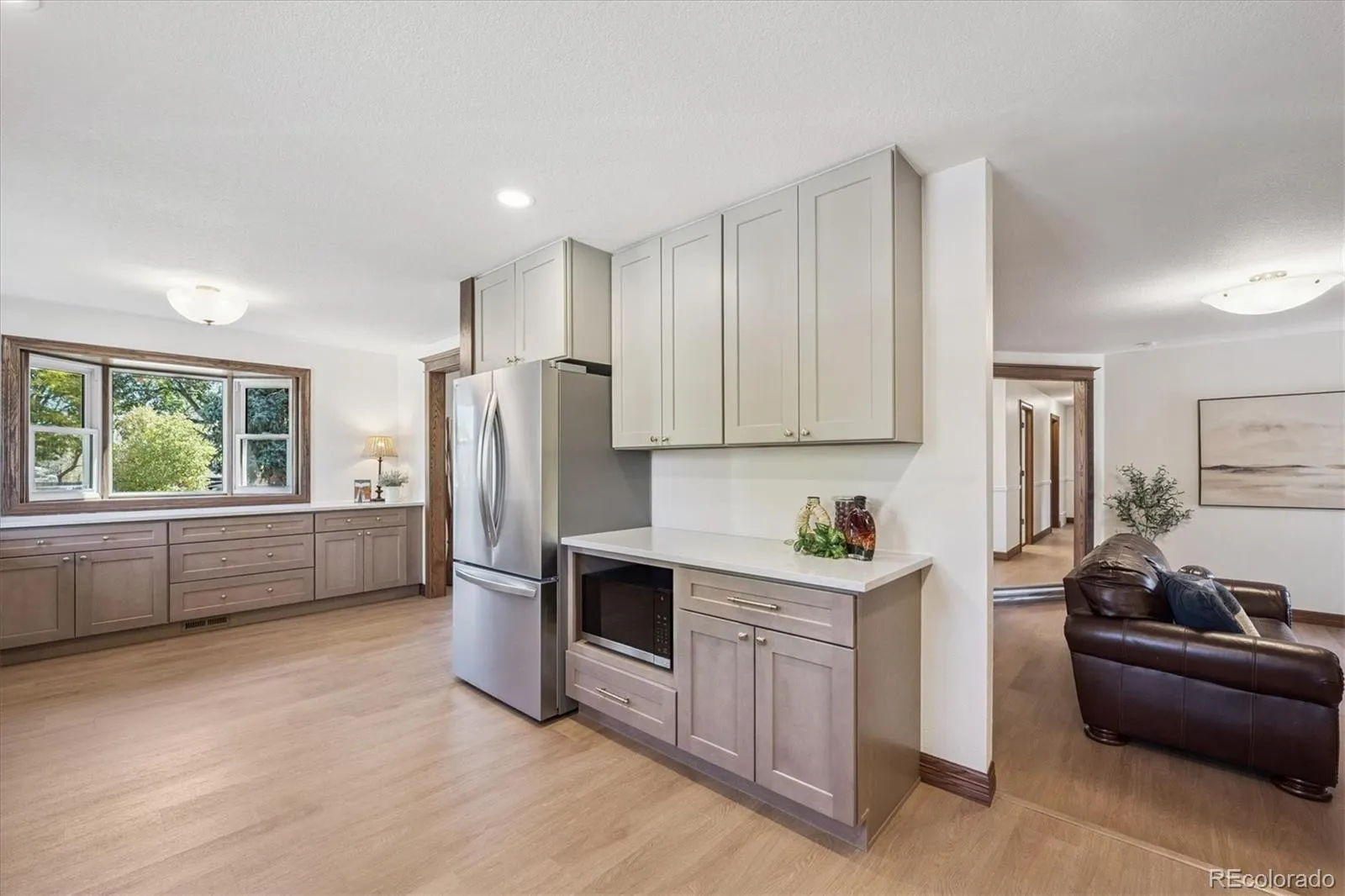 Your next home could be this stunning Applewood remodel, masterfully reimagined with exceptional craftsmanship and Colorado style. Set on a corner lot in a well-established neighborhood, this remodeled raised ranch offers over 3,750 square feet of curated living space. The expansive 5-bedroom, 3-bathroom layout has been thoughtfully redesigned for today’s homeowner. At the heart of the home lies a spectacular chef’s kitchen—an entertainer’s dream—featuring custom cabinetry, elegant quartz countertops, premium appliances, and brushed gold fixtures that add warmth and refinement. Three fully renovated bathrooms showcase designer tilework, custom cabinetry and quartz countertops, and frameless shower glass, including a luxe primary en suite. Every detail, from the hardwood doors to the hand-selected lighting and trim, speaks to quality and craftsmanship. The main level boasts new luxury vinyl plank flooring, while the expansive finished lower level—nearly 1,900 sq ft—features plush new carpeting and offers versatile living space; ideal for a media lounge, game room, home gym, and guest suite. The lower level includes a generous family room, two spacious non-conforming bedrooms, a stylishly renovated bath, and large bonus/storage room. This floorplan offers multi-generational or house hacking opportunities. Outside, mature trees and professional landscaping frame a private backyard oasis with rock retaining walls and a secluded patio—perfect for alfresco dining or quiet evenings under the stars. Additional highlights include a new furnace, newer water heater and AC, newer roof, newer double pane windows and recently installed fence for a private yard. Just steps from Lewis Meadows Park and walking trails, moments from new Lutheran Medical Center and incoming Clear Creek Crossing shopping, dining, and entertainment options. This is a rare opportunity to own a refined, turn-key home in Applewood. Call to schedule your showing!