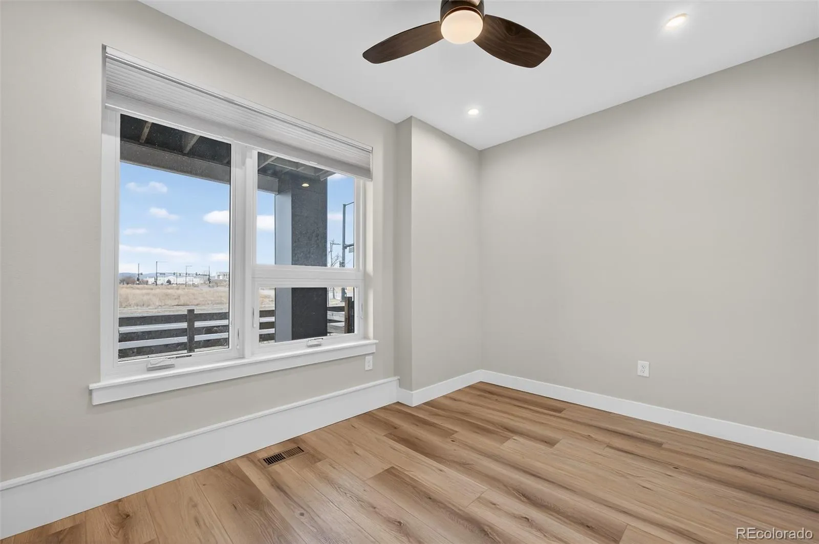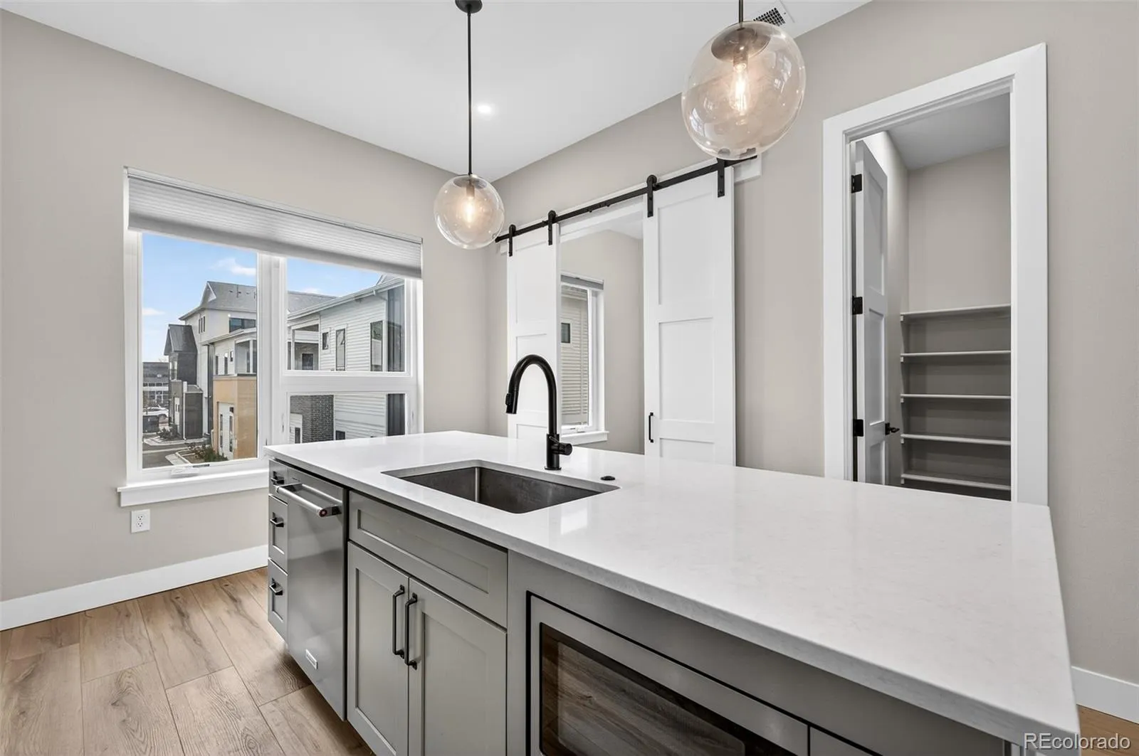 The flexible floorplan provides for ideal separation and functionality. The lower level includes a private bedroom with a ¾ bathroom and direct access from the attached two-car garage. The main living level is the centerpiece of the home, showcasing an open layout with high ceilings, a bonus room ideal for an office or dining space, its own ½ bathroom, walk-in pantry, wet bar, and a bright, west-facing living area that opens to a private balcony. Hunter Douglas Duette energy-efficient shades with a top-down/bottom-up system enhances both comfort and privacy throughout.