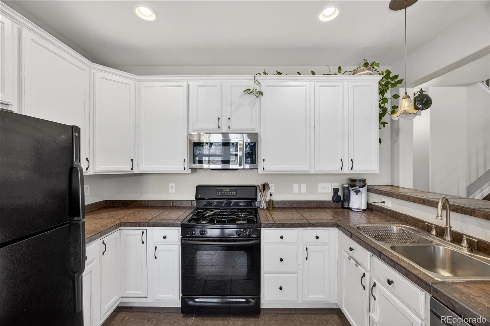 Welcome to 3707 Pecos Trail, a 3-bedroom, 3-bathroom townhouse in the heart of Castle Rock, CO, offering 1,538 square feet of functional living space with major recent updates. The home features a gas fireplace and western exposure, providing excellent natural light throughout. All windows were replaced in 2024, improving energy efficiency and overall comfort. The kitchen was fully updated in 2024, featuring new cabinets, ample storage, and a functional layout with a breakfast bar and eat-in area. Kitchen appliances include a refrigerator, range, and dishwasher, with an adjacent dining space that supports easy everyday living.