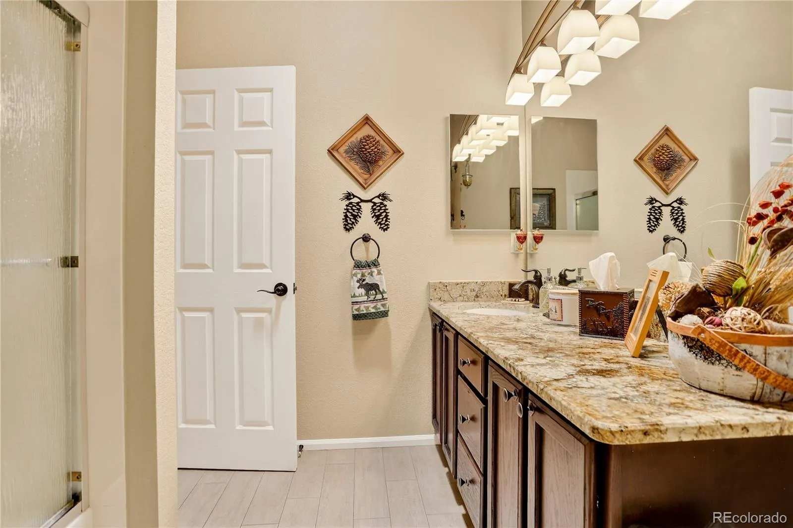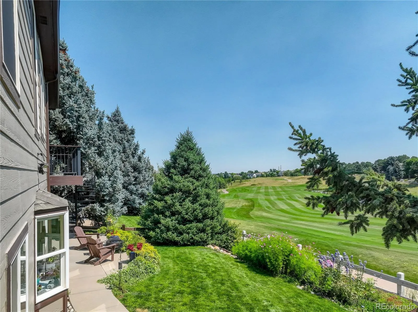 The main floor has two more bedrooms with new ceiling fans and a full bathroom. The lower-level walkout boasts a large entertainment room with surround sound, stone fireplace, and a full kitchen with quartz counters and a large pantry. It leads out to another covered patio that is also heated and a beautiful flower garden with additional sitting areas to take in the beauty of Castle Pines. The lower level has two additional bedrooms with an additional bathroom.