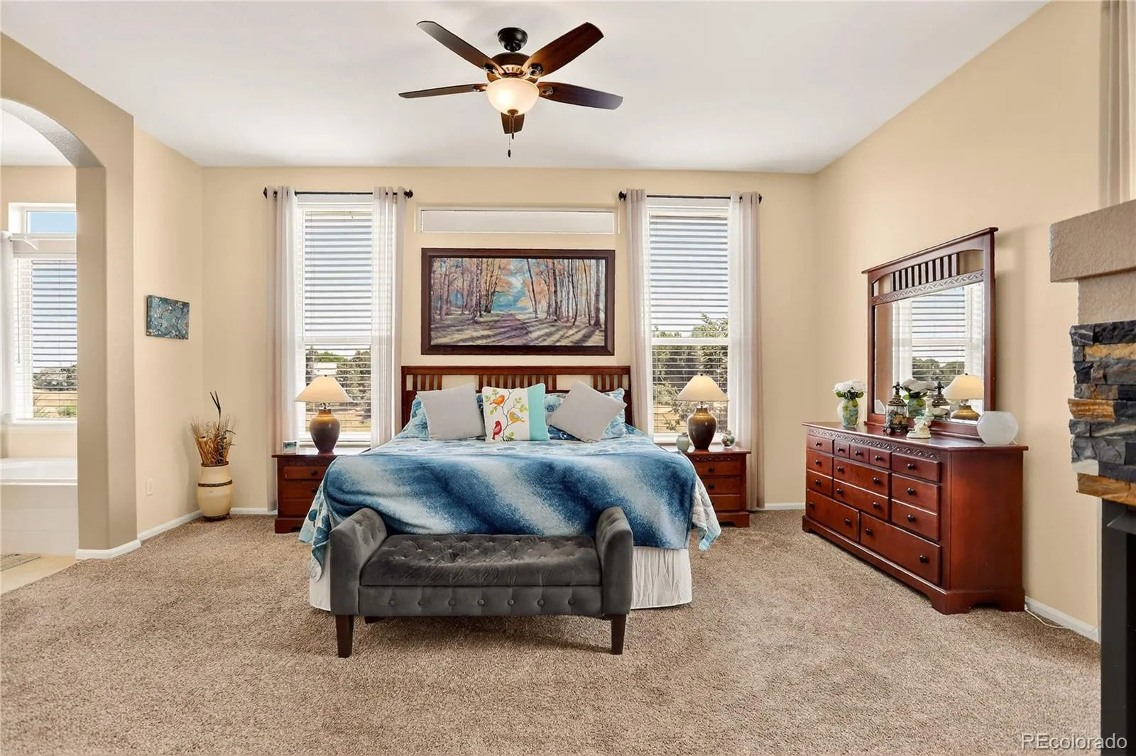 The primary bedroom is a true retreat, with a stone fireplace and a sitting area to relax and read a book. Five-piece bath with natural sunlight to calm your day.