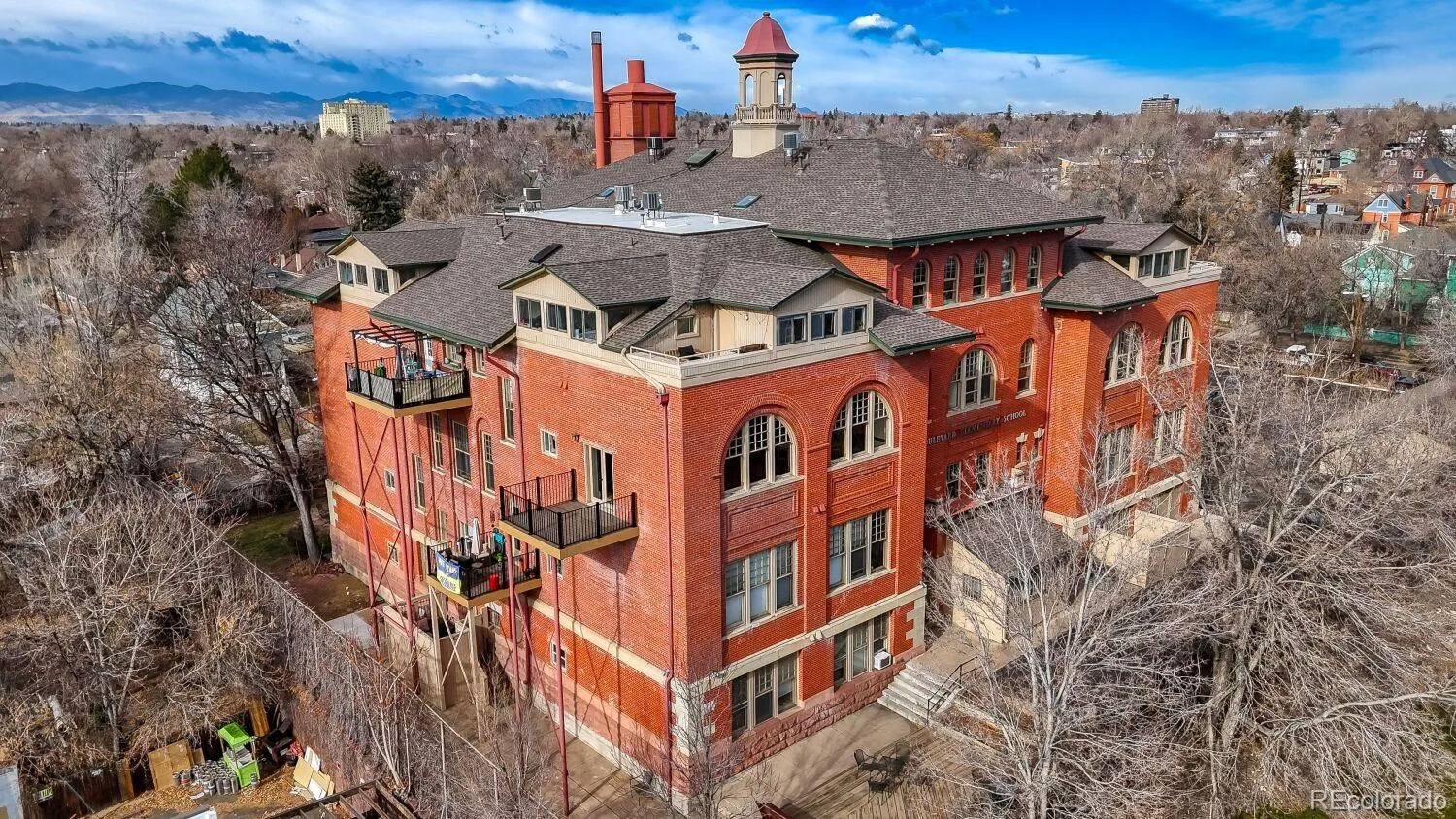 Located in the desirable Highlands/Sloans Lake neighborhood the historic Boulevard Elementary Schoolhouse was built in 1904 and converted into 28 one-of-a kind condominium units in 1984. Welcome to unit #306 which showcases the original classroom blackboard and storage cupboards and wood floors. Renovated in 2014 with appreciation/preservation of the history. 2014 Kitchen renovation includes, white shaker door fronts, slide-out cabinet inserts, new sink, Soapstone countertops, hood vented to the exterior, refrigerator new 2023, garbage disposal new 2024, dishwasher new 2017. The ¾ bathroom was renovated with a Vintage 1963 American Standard vanity with a pink sink, oversized shower, custom tile. A full en-suite bathroom was added in what was originally the cloakroom of the schoolhouse this features a Vintage 1910 clawfoot tub and Vintage wall mounted sink, in floor heating, original coat hooks and moldings were carefully removed and reattached in the bath and back hallway/closet. Interior doors are repurposed/restored, custom-milled 5 panel solid wood with antique crystal doorknobs. Dramatic arched windows to show off the spectacular City views feature custom Hunter Douglas double blinds for thermal, noise and light protection. Watch fireworks from your Livingroom at the sports stadiums within view. Private in unit laundry. Gated secure parking space #39 and guest parking. Indoor secure bicycle locker room with spaces for rent. Outdoor community gathering space with a BBQ grill. Amazon delivery lockers located within the secure gated lot.