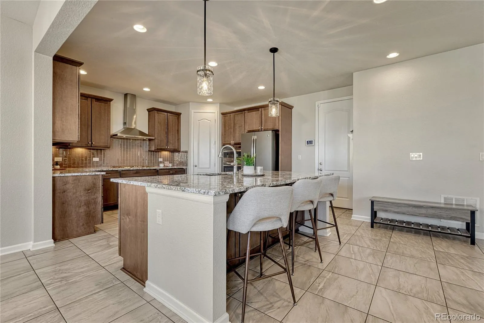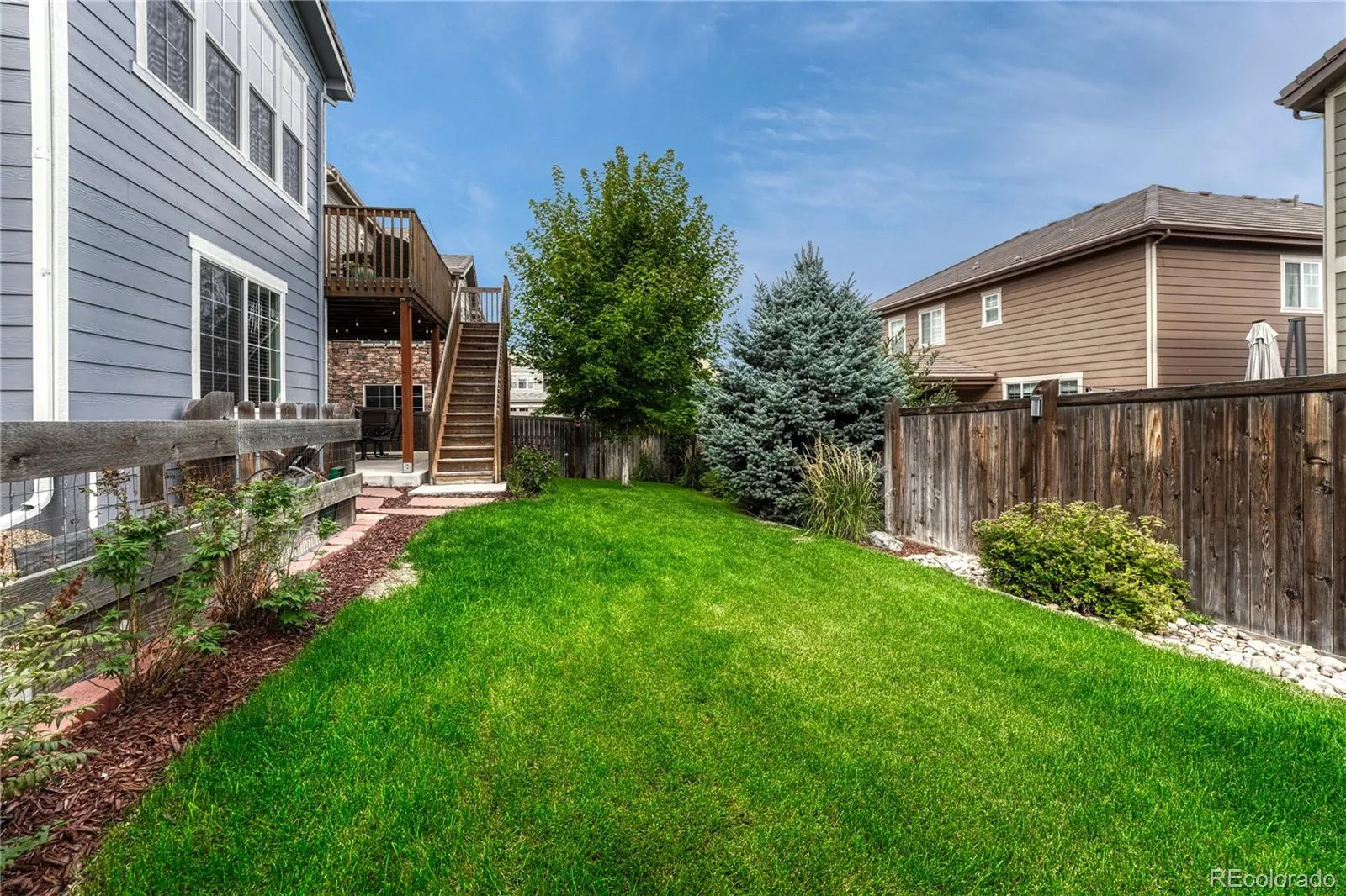 This is the one you’ve been waiting for… Situated on a peaceful cul-de-sac in the coveted Meridian Village community of Parker, this impressive south-facing home offers over 4,000 square feet of finished living space, and a beautifully designed, finished walk-out basement, blending contemporary style with comfortable living. Step into a warm and inviting open-concept layout that includes a spacious office with French doors, exquisite terrazzo tile flooring, and a beautiful sunroom adorned with expansive windows that fill the space with abundant natural light. The contemporary chef’s kitchen showcases sleek appliances, granite countertops, custom backsplash, upgraded lighting, and a generous island that connects to the eat-in dining area and family room, complete with surround sound and a cozy fireplace. Head outside to a large deck with breathtaking mountain views, where you can relax, enjoy playtime, or host memorable gatherings in the beautifully landscaped yard. Additionally, a convenient dog run allows your pets to roam freely without disturbing the lawn.