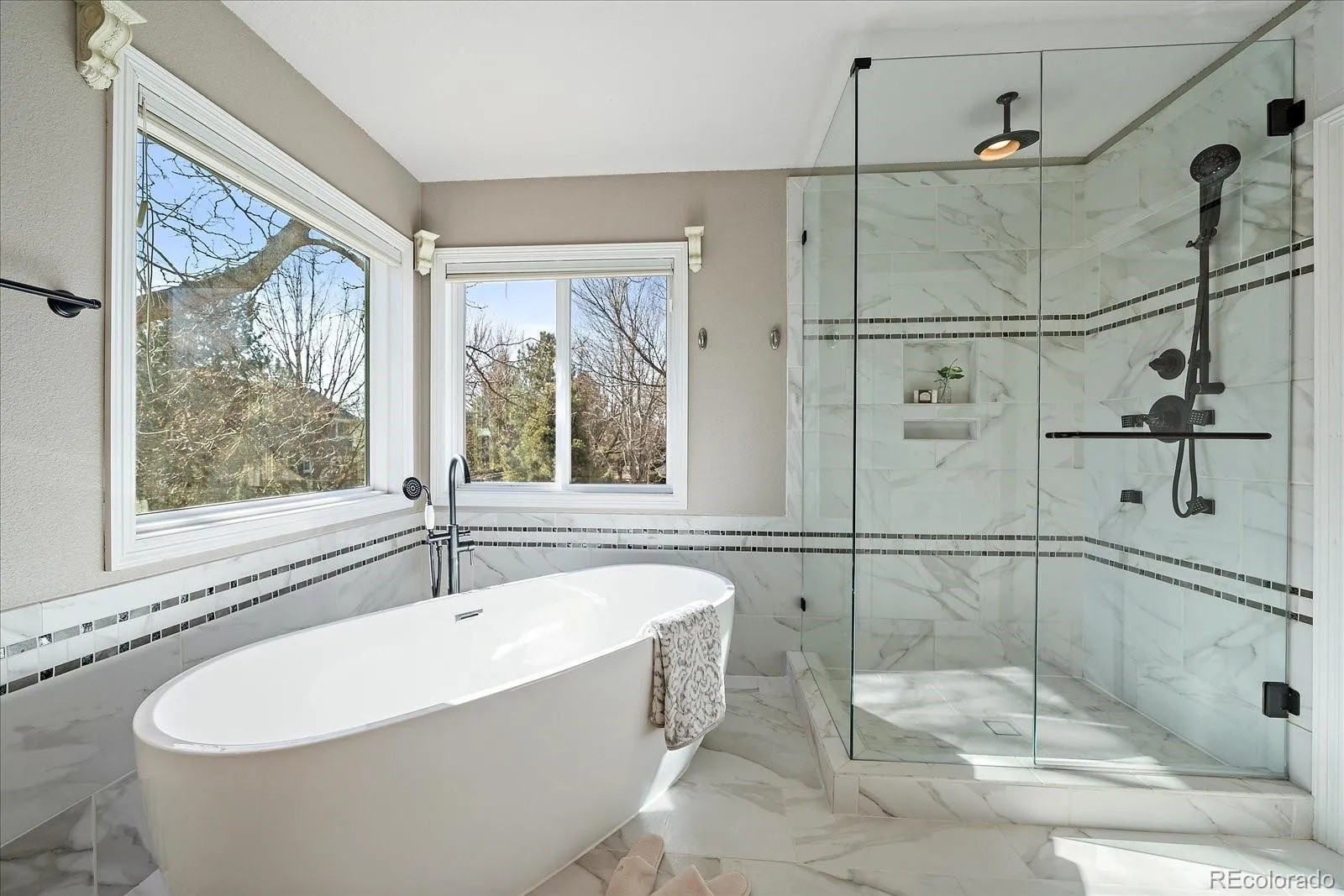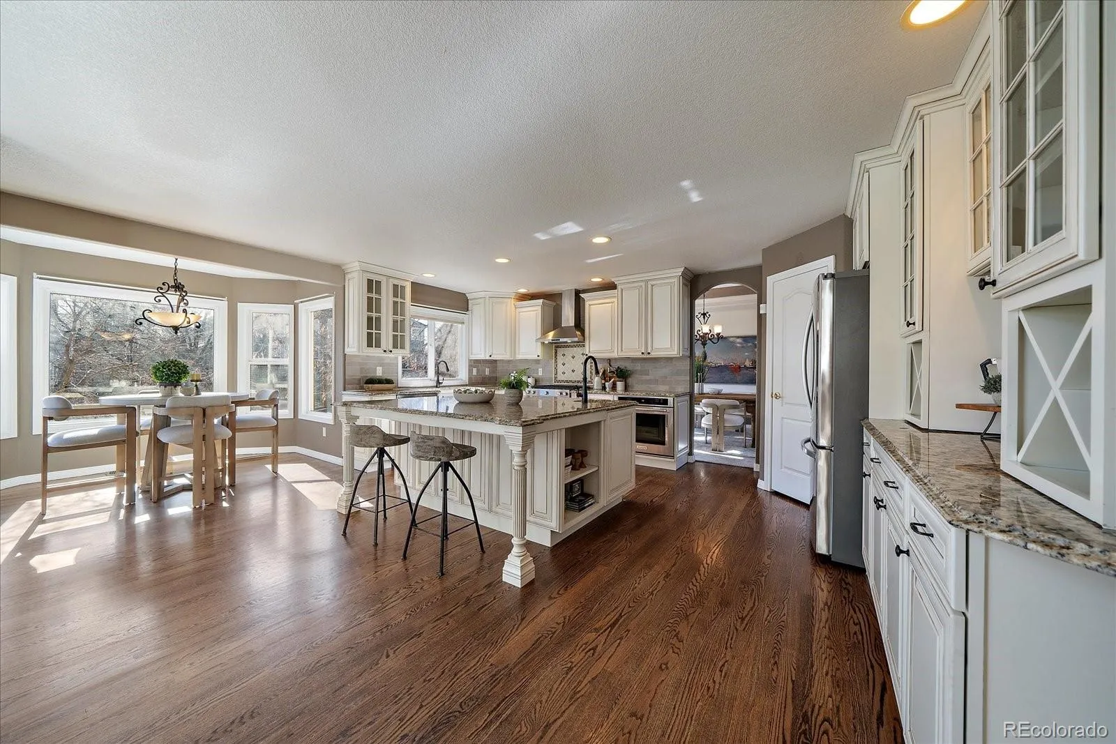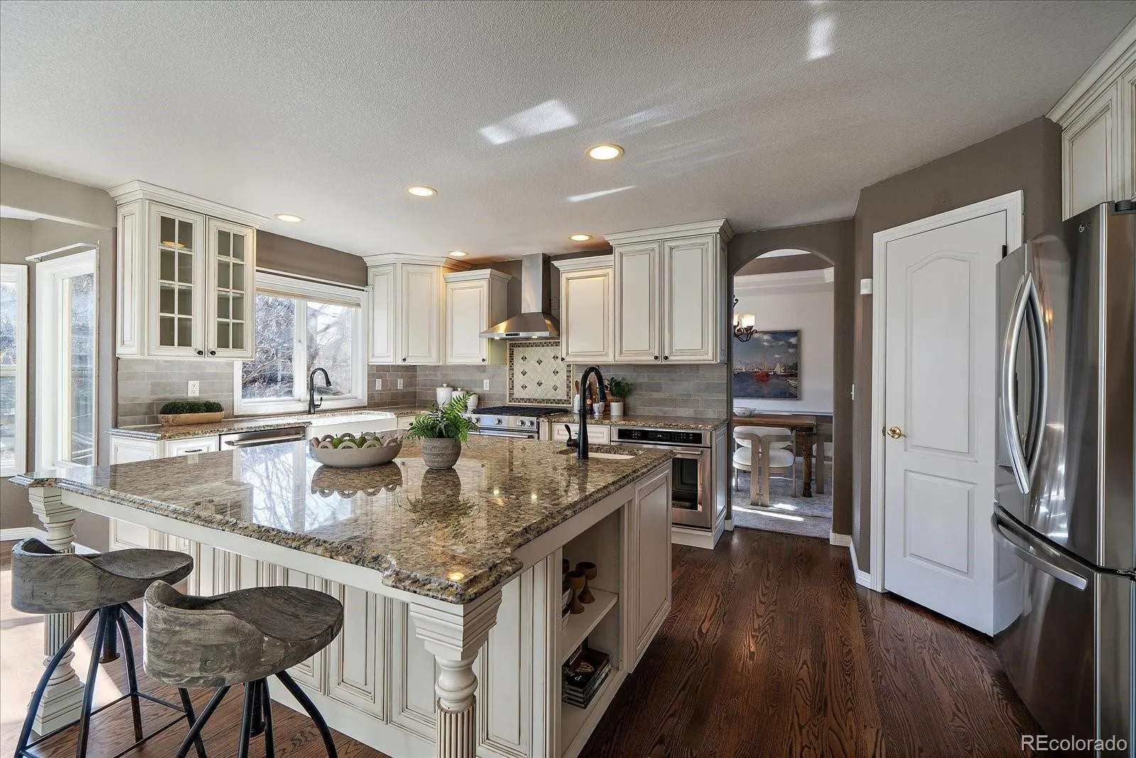An updated 5 bedroom, 5 bathroom beauty with 3-car garage on a cul-de-sac backing to a greenbelt in Willow Springs with access to the community pool, clubhouse, tennis courts, walking trails, parks and ponds! The main level features beautiful wood flooring and a dedicated office with wood floors, vaulted ceiling, plantation shutters and French doors – ideal for working from home. The living room is filled with natural light from several large windows while the dining room is accented by an elegant coffered ceiling. The updated kitchen is beautiful with wood flooring, farmhouse sink, double ovens, gas range, large island with a prep sink, abundant cabinetry and a spacious corner pantry. The breakfast nook with bay windows overlooks the backyard and greenbelt beyond. The family room features high ceilings, built-ins, a gas fireplace, and direct access to the composite deck—perfect for indoor-outdoor living. A spacious tiled laundry and mudroom features a sink basin, upper and lower cabinets, coat closet and the washer & dryer are included. Upstairs, the primary suite offers a sitting area and an updated five-piece bath with dual sinks, granite countertops, standalone tub, walk-in shower, walk-in closet, linen closet and corner windows above the tub. Two bedrooms share a Jack-and-Jill bath with double sinks and an additional upper-level bedroom includes a private 3/4 ensuite bath.