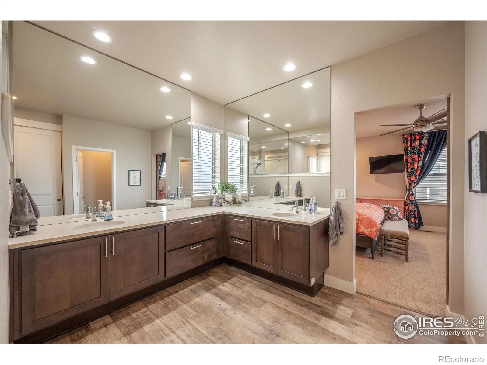 Welcome to 4593 Colorado River Drive in Firestone – a stunning Brookfield Custom built home that blends luxury, space, and effortless entertaining. From the moment you step inside, you’ll notice the expansive open-concept layout flooded with natural light, soaring 8′ doors, & oversized windows that create an airy, inviting feel throughout. The heart of the home is the stunning chef’s kitchen, featuring Bosch and Kenmore Elite appliances, Tharp custom cabinetry, a massive center island, gas cooktop, & double ovens-perfect for hosting everything from casual gatherings to holiday dinners. Full-wall glass patio doors seamlessly connect the interior to a huge partially covered side porch, making indoor-outdoor entertaining a breeze. The main floor also offers a generous private office-ideal for working from home, along with a thoughtfully designed mudroom & extended pantry space off the 3 car garage-perfect for easy grocery drop-offs and everyday organization. The living area is anchored by a modern fireplace, custom walnut mantel & shelving, adding warmth & style. Upstairs, you’ll find 3 spacious bedrooms (secondary bedrooms are separated by a wonderful jack & jill bathroom), primary suite is on the back of the home offering comfort & privacy for everyone. Primary Suite is generous with an onsite bathroom that will knock your socks off! The finished basement expands your living space even further with a large family room & fantastic dry bar-ideal for entertaining, guests. 4th bedroom & bathroom are also in the basement, plus two separate storage areas. Outside, enjoy relaxing mornings on the welcoming front porch, & spend evenings in the backyard garden area with a nicely sized yard, perfect for play, pets, or quiet downtime. This Energy Star-rated home is exceptionally well insulated, providing year-round comfort & a quiet interior. Luxury finishes, custom details, & a layout designed for both everyday living & unforgettable entertaining-this home truly has it all.
