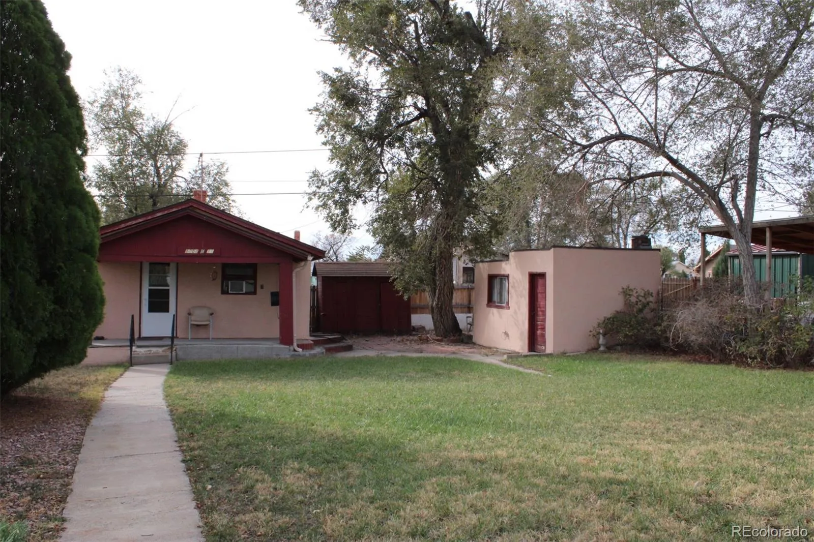 This one-bedroom, one-bath ranch-style home offers efficient living with a practical layout and flexible use of space. The dine-in kitchen includes a gas range, refrigerator, and stackable washer and dryer, with room for a small table. The living area features warm wood-paneled walls and a ceiling fan for comfort. For those looking to reconfigure the layout, the living room could easily serve as a bedroom, with the existing bedroom converted into a large walk-in closet or home office. The updated 3/4 bath includes a walk-in shower, and built-in cabinetry throughout the home provides additional storage. Outside, the fenced yard includes grass, mature trees, and two outbuildings, a storage shed and a separate workshop that’s ideal for projects, crafts, or extra storage. The covered front porch offers a shaded spot to relax and enjoy the evening breeze, while the large gravel area provides plenty of off-street parking. Located near parks, schools, shopping, and I-25 access, this property is a great option for a homeowner or investor looking for an affordable home with creative potential and convenient access to amenities.