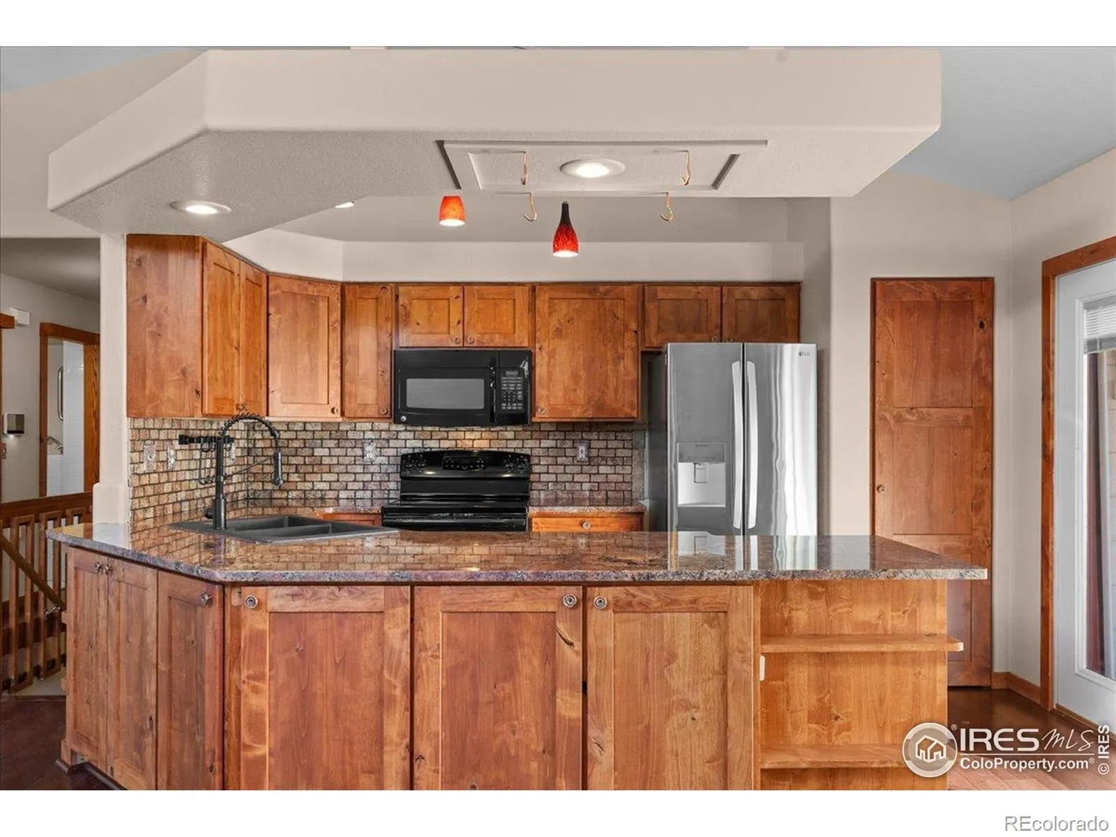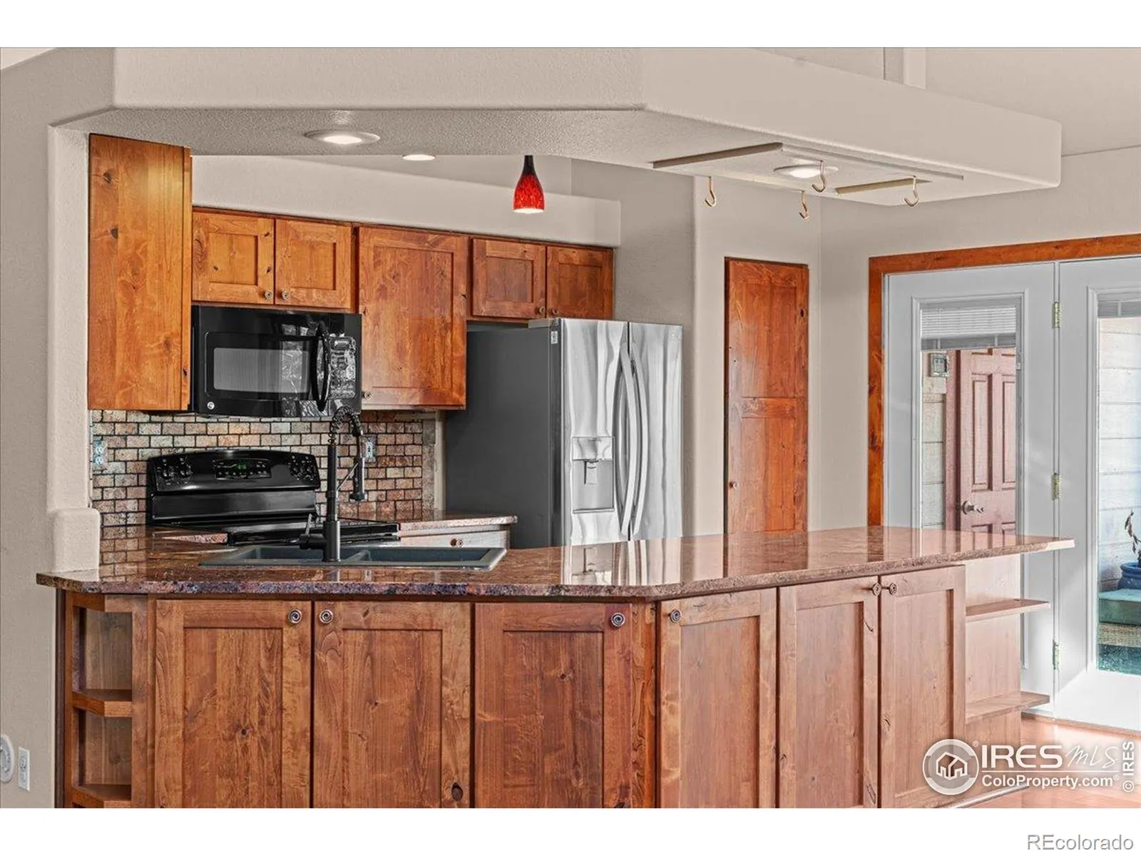 Centrally located in Loveland and directly across from the neighborhood park, this beautifully updated ranch-style home features an open great room concept that flows seamlessly into the kitchen, creating an inviting space for everyday living and entertaining. The kitchen is appointed with granite countertops, stainless steel appliances, gorgeous wood floors, alder doors and trim, and newer windows that fill the space with natural light. The main floor offers two bedrooms, two updated bathrooms, and a private office with French doors. Finished basement includes a large living room, two additional bedrooms, and 3/4 bath-ideal for guests or multi-generational living. Recent upgrades include new interior paint, new main-floor carpet, stylish barn doors, and a tankless water heater. Owned solar panels enhance energy efficiency and help reduce monthly utility costs, adding long-term value and sustainability. Accessibility features include a walk-in tub and backyard handicap ramp and wheelchair access in garage. Enjoy front deck and covered deck in backyard, low-maintenance xeriscape landscaping with all native plants and drought resistant, and a dry sauna included for added comfort and relaxation.