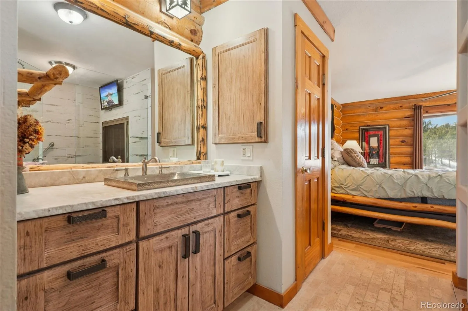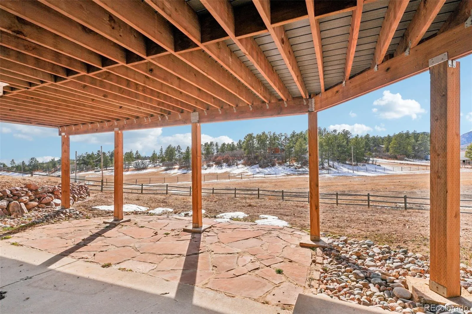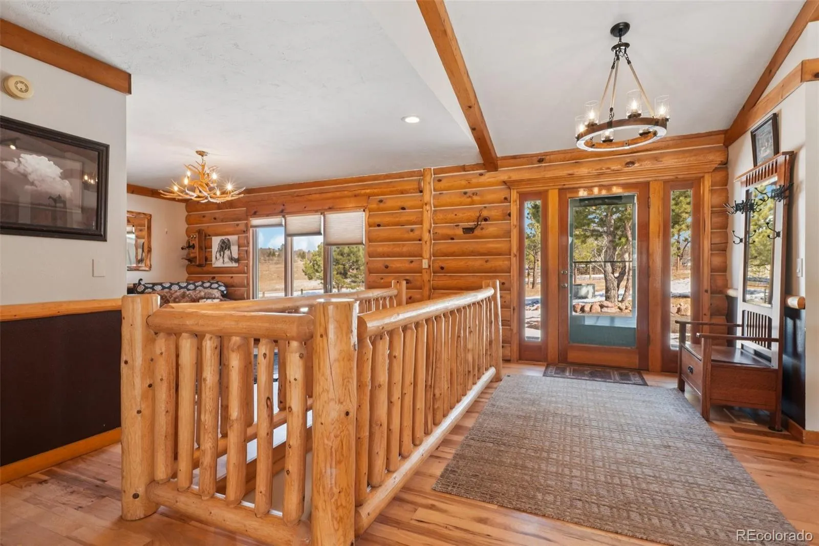 Welcome to this classic Colorado ranchette on 5 acres of fenced horse property with a stunning 3800 square foot log home in Pine Hills subdivision of Monument framed by sweeping views that capture exactly why people choose to live in Colorado. Enter this beautifully remodeled home with loads of light, hickory floors throughout and vaulted ceilings.The remodeled gourmet kitchen has it all with quartzite countertops, alder custom cabinets, stainless appliances, gas cooktop, walk in pantry and a massive island with beverage fridge. The great room/living room is open to the kitchen with free standing gas fireplace and access to the trex deck with southern exposure. The main floor primary bedroom and amazing remodeled 5 piece primary spa bath with fireplace is off of the living room. Also on this floor is the formal dining room (currently used as reading nook), guest 3/4 bath and another main floor bedroom that is currently used as a study. The lower level with lvp floors, family room with fireplace, built-ins, 2 additional bedrooms and 3/4 bath as well as laundry and storage .Outside is where this property really sets itself apart with the 4000 SF outbuilding built in 2021. The building is split evenly between a premium heated workshop and an attached indoor horse arena with electric, water and much more. There is also a 4 stall 2 story barn with water and electricity. All this 1/4 of a mile from Pike National Forest and loads of trail plus views from every part of the property. This place is an entire lifestyle whether you are an equestrian, car enthusiast, rv/boat owner, collector, hobbyist or just want some open space and room this peaceful residence has it all. This location can’t be beat in desirable and convenient Monument offering the perfect blend of peaceful rural living with trails for hiking, biking and horseback riding outside your back door yet less than 12 minutes from I-25, shopping, restaurants and more with close proximity to Denver and Colo Springs.