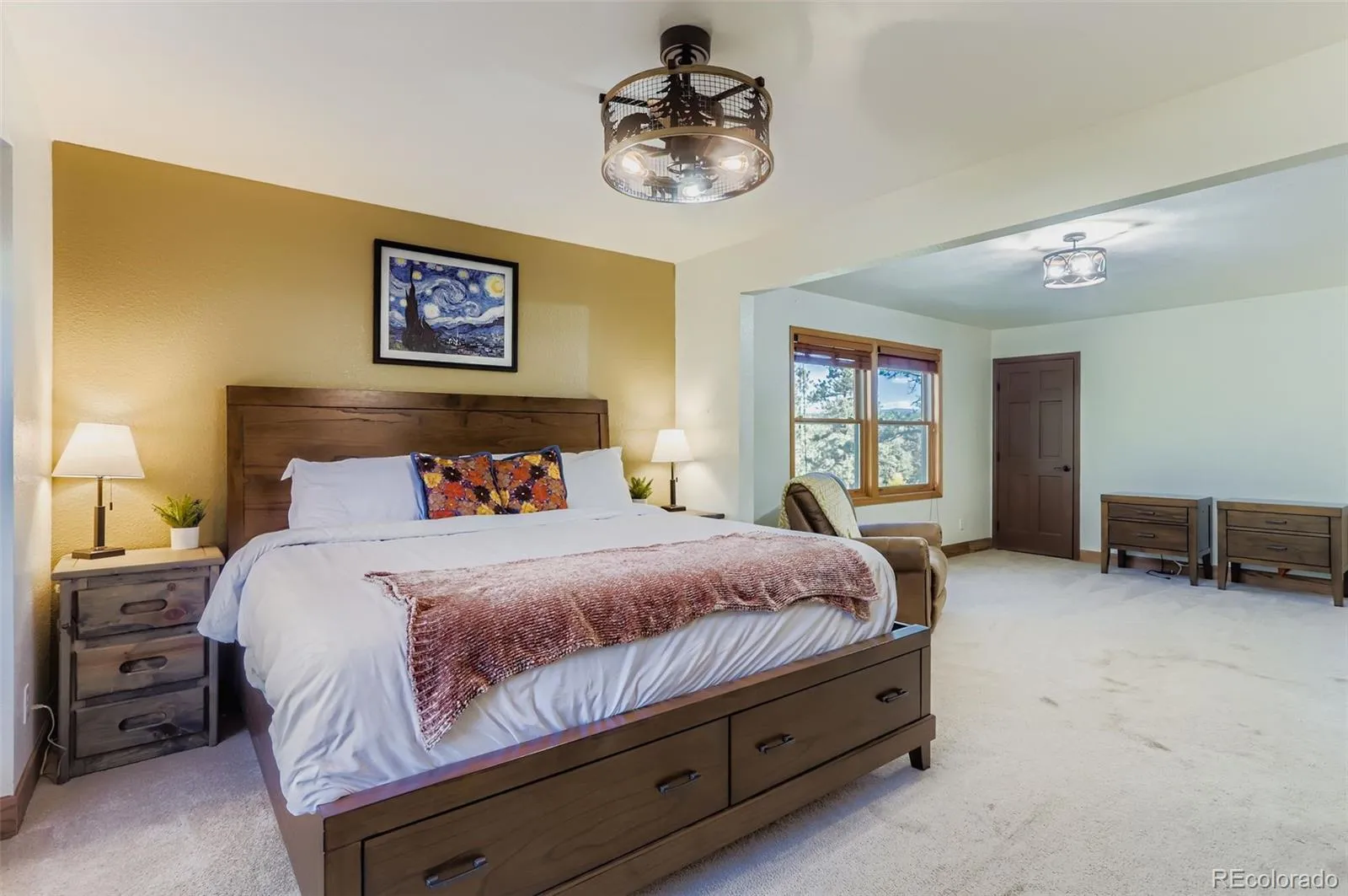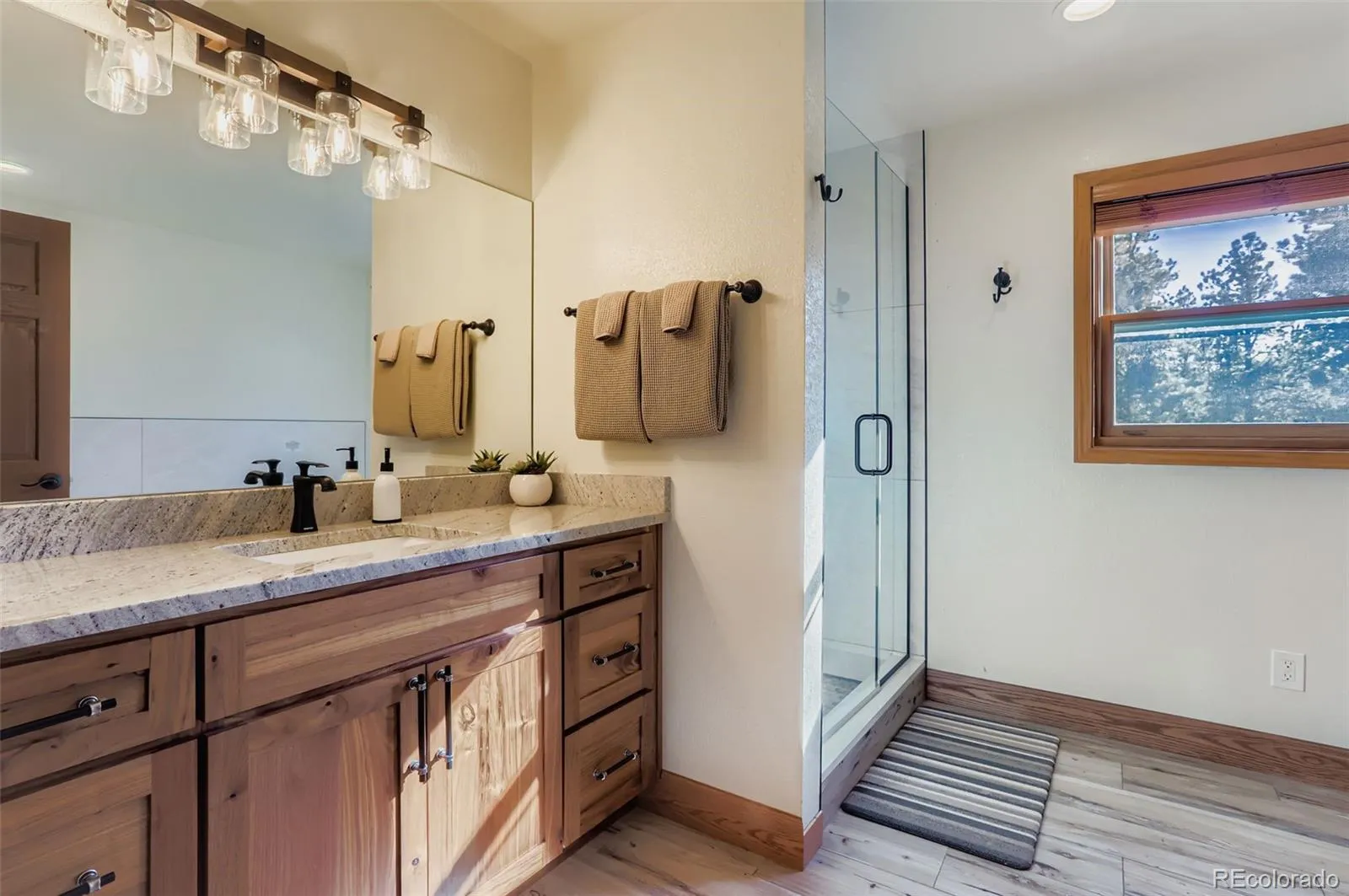 Meticulously maintained and beautifully renovated walk-out ranch in Mill Iron D Estates on 2 fenced, fire-mitigated acres with peaceful mountain views and wildlife. This light-filled open-concept home features an expanded main level, stunning stone fireplace with granite accents, new cabinetry throughout, and a bright country kitchen with ceramic tile and added lighting. Luxury vinyl flooring spans the main areas, with new carpet in all bedrooms. Bathrooms have been fully remodeled, including an enlarged lower bath. Updates include new wood stairs, ceramic tile in the basement, remodeled laundry room, nearly all new interior and closet doors, upgraded lighting throughout, fresh interior and exterior paint, and a new front entry door. Enjoy new front and rear decks with added lighting and concrete base, enclosed dog run, oversized 3-car garage, owned solar system, hot tub, transferable 50-year roof, high-efficiency furnace and water heater, skylights, and quick access to Denver, shopping, dining, and world-class skiing. Move-in ready mountain living with modern upgrades throughout.