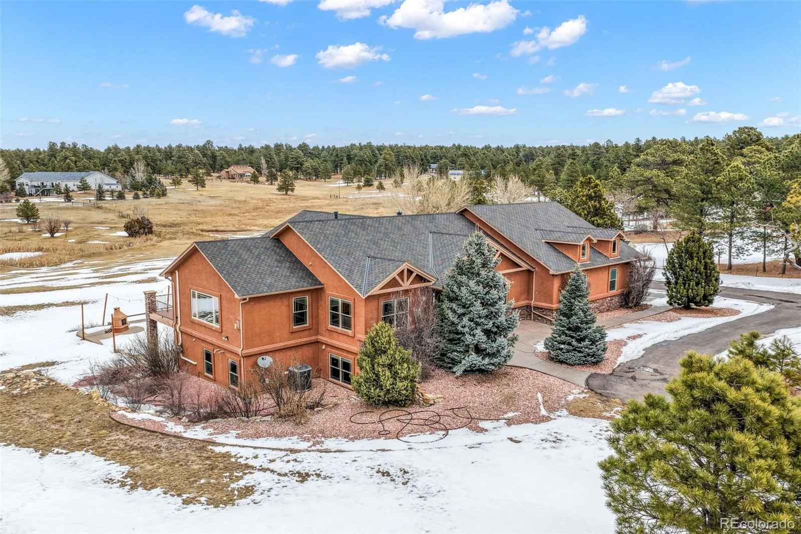 Set on 5 private acres in the desirable Wildwood Ranch Estates community of Black Forest, this stunning custom ranch-style home offers 4,626 square feet of beautifully designed space. Exceptional curb appeal welcomes you with a circular driveway, four-car attached garage, and striking stucco-and-stone exterior with a covered front porch. Inside, hardwood floors, custom wood accents, and high-end finishes create a warm yet elegant atmosphere. A formal dining room sits just off the entry, while a main-level bedroom with an adjacent full bath is perfect for guests or a private office. The inviting living room features a dramatic stacked-stone gas fireplace, knotty alder built-ins, and expansive windows that fill the home with natural light.The chef’s kitchen is the true centerpiece, showcasing stainless steel appliances, a double oven with gas cooktop, warming drawer, microwave, hood vent, knotty alder cabinetry, large walk-in pantry, and oversized island ideal for entertaining. The main-level laundry room includes a sink, granite countertops, custom cabinetry, and a window. Retreat to the spacious primary suite, complete with its own stacked-stone gas fireplace, plantation shutters, and private access to the expansive composite deck. The spa-like bath features dual granite vanities, a soaking tub, walk-in shower, and a custom closet.The finished walkout basement is built for entertaining with a large recreation area, media room, wet bar with mini fridge, microwave, and sink, plus three additional bedrooms — two connected by a Jack-and-Jill bath. Step outside to exceptional backyard privacy featuring a beautiful concrete patio framed by stacked stone pillars, creating a peaceful setting ideal for relaxing or gathering with guests. Zoned for horses and equipped with well and septic for lower utility costs, this immaculately maintained home also offers central air and three fireplaces. A rare blend of luxury, privacy, and Colorado beauty — truly a must-see.