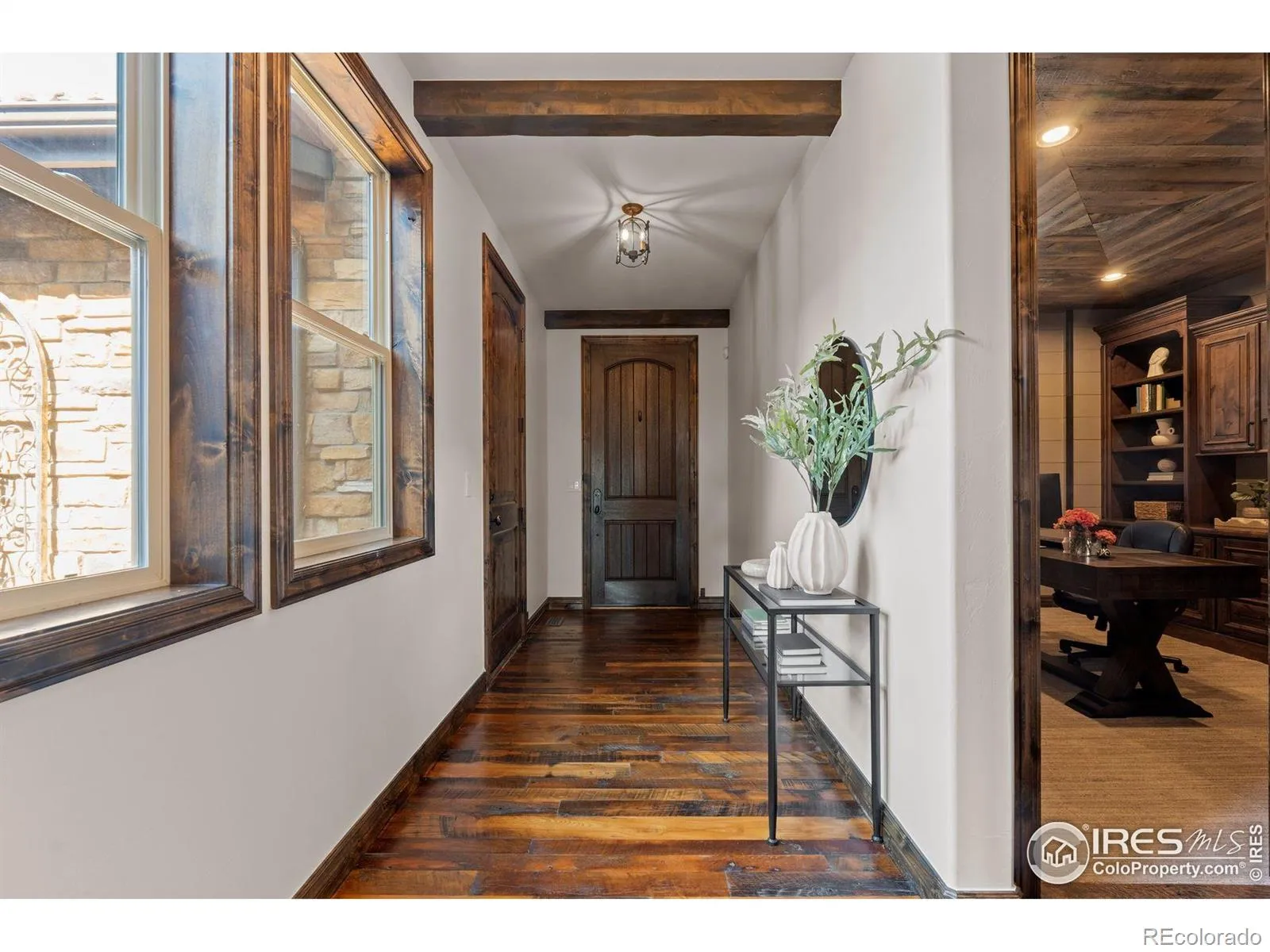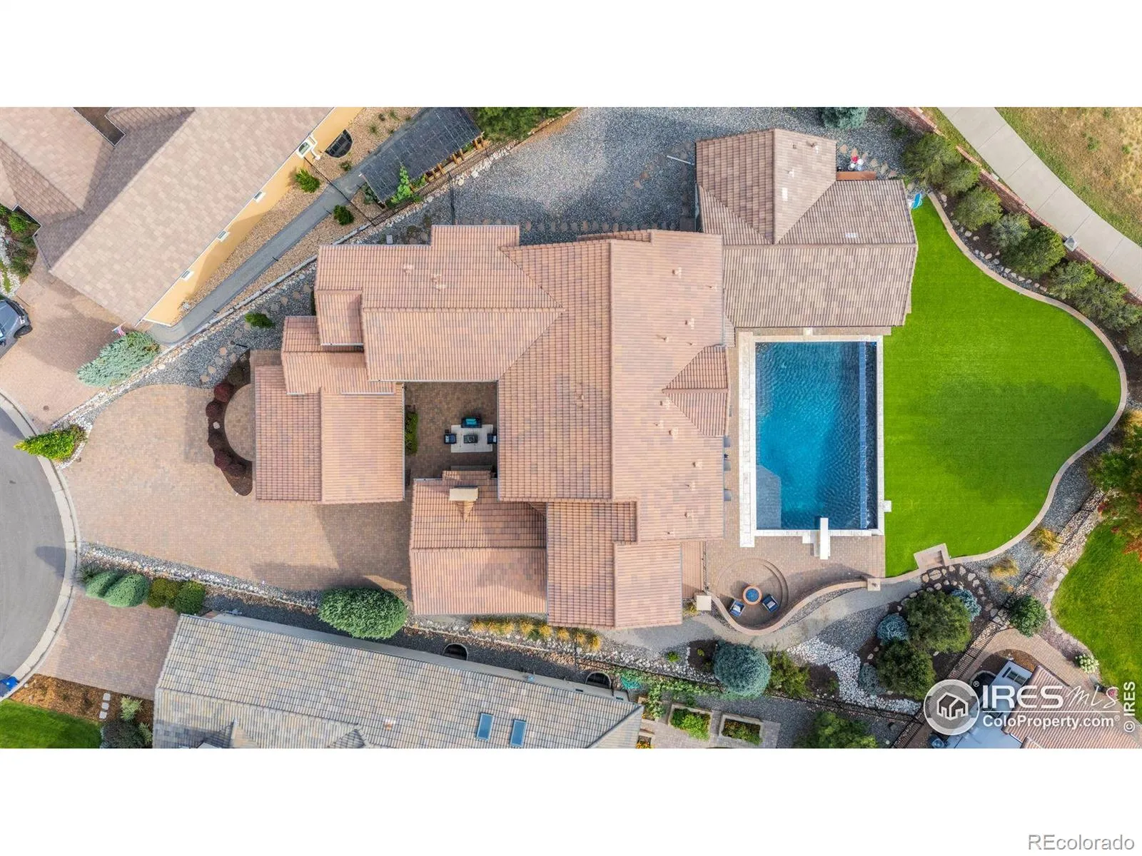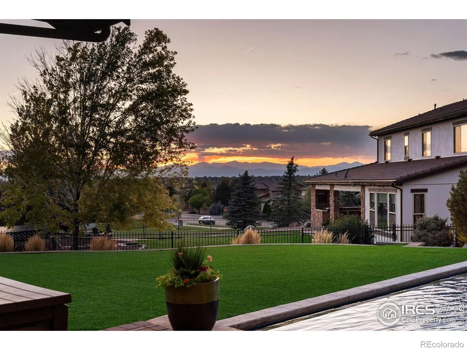 Sited on one of the premier lots in all of Heritage Hills, this fully loaded residence redefines luxury living with over $1 million in bespoke upgrades and a jaw-dropping pool house addition completed in 2022. Perfectly positioned on an oversized, west-facing cul-de-sac lot (originally the highest lot premium in Overlook), the home captures unforgettable mountain views and sunsets. Anchored by a resort-style infinity-edge pool and hot tub, the pool house includes an incredible spa-like shower bath, wet bar and private laundry creating an entertaining space that’s as functional as it is stunning. The thoughtfully designed outdoor setting also features low maintenance turf, a built-in firepit, and expansive patios designed to take full advantage of the incredible view. At the heart of the home is a dramatic central courtyard that connects seamlessly to the interior and offers year-round enjoyment with its built-in grill and custom stone fireplace. Inside, every surface was thoughtfully selected-high-end reclaimed oak floors, knotty alder doors and shutters and extensive custom cabinetry. The central kitchen is beautifully appointed with professional-grade KitchenAid appliances, highly upgraded granite countertops and a custom walk-in pantry The main level also includes a custom office, a 2nd office or “project room” with abundant cabinetry, and a front entry expansion that allows interior access to both garages-each finished with epoxy floors and custom cabinetry. Upstairs, the luxurious primary suite offers breathtaking mountain views, a spa-caliber primary bath, and a walk-in closet that connects directly to the upstairs laundry. Three additional ensuite bedrooms and a spacious loft with custom built-in desks complete the upper level. The finished basement impresses with a 120″ theater, a decked-out bar, a private 5th bedroom, a gorgeous shower bath, and a 275-square-foot fitness space. This one-of-a-kind Heritage Hills estate delivers an elevated Colorado lifestyle
