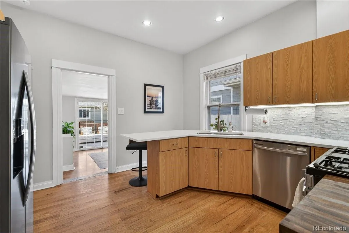 The refreshed kitchen features all-new smart appliances, quartz countertops, and updated cabinetry, creating a clean, functional, and elevated space. The living area is anchored by a redesigned electric fireplace with a Colorado-sourced live-edge black walnut mantel, adding warmth and a striking focal point. An open main-floor layout connects the living, dining, and kitchen spaces, making everyday living and entertaining effortless.